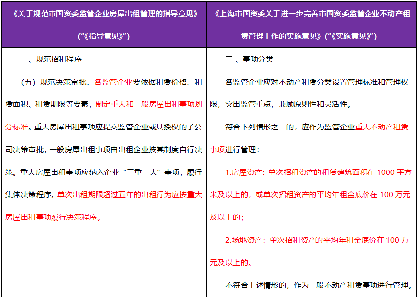 为进一步强化落实上海市国有资产监督管理委员会(以下简称“市国资委”)监管企业不动产租赁管理主体责任,建立健全不动产租赁管理体系,规范不动产出租工作流程,提升不动产租赁效益与管理水平。在2021年4月市国资委已经制定发布了《关于规范市国资委监管企业房屋出租管理的指导意见》(现行有效)(以下简称“《指导意见》”)的基础上,市国资委于2023年9月15日发布了《上海市国资委关于进一步完善市国资委监管企业不动产租赁管理工作的实施意见》(现行有效)(以下简称“《实施意见》”),并于2023年10月1日正式实施,针对市国资委监管企业(以下简称“监管企业”)的不动产租赁管理行为作出了进一步的规范和要求。 本文就《实施意见》与《指导意见》的主要不同进行比较和分析,并对《实施意见》的亮点部分进行解读。 从总体要求上,《实施意见》延续了《指导意见》所提出的三个工作原则,坚持全面覆盖与分类管理相结合原则、坚持法律约束和内部治理相结合原则以及坚持公平公开和高质量发展相结合原则。《实施意见》对于“适用范围”“事项分类”“招租程序”以及“职责分工”分别制定了具体的规定和要求,上述的三项原则均贯穿其中。 一、适用范围 在“适用范围”上,《实施意见》所明确的适用范围是“监管企业及其下属各级国有企业(以下简称“各级子公司”)”,《指导意见》对于适用范围的表述则是“各监管企业及其下属各级国有及国有控股、国有实际控制企业(以下简称“各级子企业”)”。《实施意见》未将国有控股以及国有实际控制企业在“适用范围”条款中明确,但国有及国有控股、国有实际控制企业的不动产租赁行为均应符合《实施意见》的要求。此外,相对于《指导意见》规范的是“房屋出租”行为,《实施意见》则分别定义了“不动产”以及“不动产租赁”的概念,规范了表述的同时,扩大了管理工作的范围。 二、事项分类 在“事项分类”上,《指导意见》仅将“单次出租期限超过五年的出租行为”划分为重大房屋出租事项的情形,《实施意见》则明确罗列了两类应作为监管企业重大不动产租赁事项进行管理的情形:针对房屋资产,单次招租资产的租赁建筑面积在1000平方米及以上的,或单次招租资产的平均年租金底价在100万元及以上的,属于重大不动产租赁事项。针对场地资产,单次招租资产的平均年租金底价在100万元及以上的属于重大不动产租赁事项。 《实施意见》要求各监管企业应对不动产租赁分类设置管理标准和管理权限,其对于重大不动产租赁事项的划分为监管企业分类设置标准提供了一定的参考依据。 三、招租程序 首先,《实施意见》明确要求了重大不动产租赁事项必须制作租赁方案,并且内容上至少需要包含拟出租资产的基本情况、出租用途及期限、承租条件、租金底价及确定依据、租金调整幅度、招租方式、承租方资格条件等。对于一般的租赁事项未作该要求。 其次,《实施意见》要求重大不动产租赁事项必须纳入“三重一大”事项,履行集体决策程序。需要注意的是,除了上述列明的两类情形,出于严格把控限制无序转租和低效长租的需要,“因企业发展需要或不动产特性确需转租的”和“单次租赁合同期限超过5年”的不动产租赁事项也需要纳入“三重一大”事项,履行集体决策程序。一般不动产租赁事项则由监管企业或其授权的子公司按其制度决策。 除此以外,《实施意见》还明确要求重大不动产租赁事项应当通过交易集团以进场公开招租的方式确定承租人。从招租到进行合同磋商与签订以及最后的合同备案全流程都需要在交易集团完成。在国有资产交易活动中,存在允许“非公开协议”的方式进行交易的情形,不动产租赁活动也不例外。《实施意见》就以附件的形式罗列了11项可不公开招租的情形,其中包含了“其他特殊情形(不适于公开招租)的出租,经向市国资委报备同意的”灵活操作口径。 对于一般不动产租赁事项,监管企业便可自行组织公开招租,但也作出了应在交易集团的自主信息发布平台及其他自选公开平台发布招租信息公告,公告期限不少于五个工作日的一定程序要求。 四、职责分工 在“职责分工”上,《实施意见》的分工明确[1]、清晰,有利于不动产租赁工作在公平公开的情况下高效且有序地开展。具体而言,由市国资委主要承担着监督的职能,需要同时履行对监管企业和交易集团的监督职责;监管企业作为实施主体,则负责制定管理制度,明确管理责任、管理权限及工作流程,负责规范管理自身以及监管所属各级子公司的不动产租赁管理行为,注重与交易集团的对接;《实施意见》也提到了交易集团在不动产租赁工作中的职责,其主要负责为监管企业公开招租提供信息发布平台、交易平台和服务平台;对进场公开招租行为进行规范性审核等。 综上,《实施意见》的出台为市国资委监管企业及其下属各级国有企业的不动产租赁管理工作制定了更高的要求,提供了更为详细的规范与指导,同时也进一步引入交易集团参与监督管理不动产租赁工作。相信《实施意见》将会促进监管企业不动产租赁工作更加公开透明、合法规范,推动监管企业实现高质量发展。 特别声明: