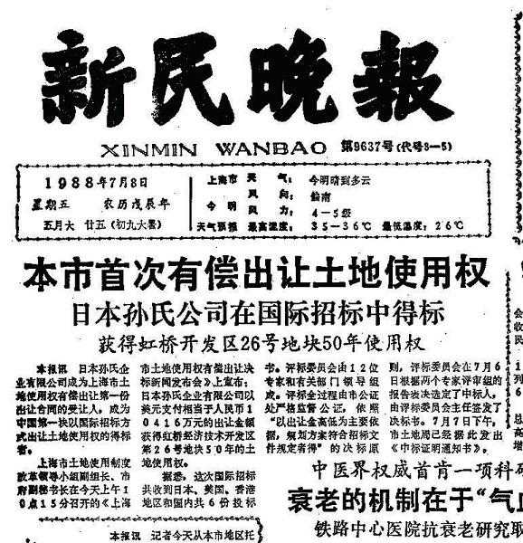 昔1988年7月8日的新民晚报刊登消息,日本孙氏企业有限公司成为上海市土地使用权有偿出让第一份出让合同的受让人,成为中国第一块以国际招标方式出让土地使用权的得标者。 今当年的地块原址上建成的太阳广场,今天在虹桥已经不是很显眼,但是批租制度的“破冰”,让土地真正成为重要的生产要素在市场流通,中国城市国有土地资源资本化和土地资源配置走向市场化。 1988年7月9日的新民晚报头版刊登文章《本市首次有偿出让土地使用权》,其中有几个数字格外抢眼:人民币10416万元,50年的土地使用权。上海由此成为改革开放后中国大陆第一个按照国际标准开展土地批租的城市,拉开了中国土地使用制度改革的序幕。当时的市场已经敏锐地意识到,长期被无偿划拨、无限期使用的土地,已经在市场经济中恢复了其应有的作用。 十一届三中全会后,如何紧密按照中央重大决策部署,走出改造、振兴上海新路,是上海面临的艰巨任务。从1985年起,在深刻领会中央精神的基础上,上海市委、市政府通过广泛调研,决定从制约全市经济发展最突出、最紧要的问题——地方财政捉襟见肘入手,在全国率先推进土地使用制度改革,积极探索以城市国有土地按规划有限年期批租的新模式,取代长期实行的无偿、无限期、无流通使用的行政划拨单轨制模式,真正激活土地作为最重要生产要素的内在经济价值,从而最大限度拓展城市发展和建设所需的资金渠道。 在《破冰——上海土地批租试点亲历者说》一书中,原上海市土地批租办副主任王安德回忆,在改革开放初期,上海的城市基础设施欠账也很严重,形象的说法是旧城有80万个煤球炉、80万个马桶,还有几千万平方米的危旧房屋。这种情况下上海怎么办?那时国务院也很关心,专门发文提出要改造上海老工业基地,专门召开上海经济发展战略研讨会。此后又在这个基础上,制定了上海经济发展战略汇报提纲。最终上海市制订了“三张蓝图”,分别是经济发展战略、文化发展战略以及上海城市总体规划,明确提出了城市功能转变和产业结构调整。这“三张蓝图”绘就后,马上碰到一个问题,蓝图绘得很好,但是怎么做?没有钱,寸步难行,心有余而力不足,步子迈不开。怎么办,只能向改革要出路。从这个意义上说,上海的土地批租也是被逼出来的。 上海在全国率先推进土地使用制度改革,积极探索以城市国有土地按规划有限年期批租的新模式,取代长期实行的无偿、无限期、无流通使用的行政划拨单轨制模式。最终通过国际招标,成功转让虹桥经济技术开发区26号地块。这在海内外引起强烈震动,释放出推进改革开放的坚强意志和决心。上海由此成为改革开放后内地第一个按照国际标准开展土地批租的城市,拉开了中国土地使用制度改革的序幕。 1988年12月29日,第七届全国人大常委会第五次会议通过《关于修改的决定》,明确规定“土地使用权可以依照法律的规定转让”,意味着国家大法承认土地使用权的商品属性。从一块土地的出让到通过宪法建立完善相关制度,上海土地批租的试点经验,对今天改革开放再出发,都将产生深远影响和宝贵启示。 新民晚报首席记者方翔
