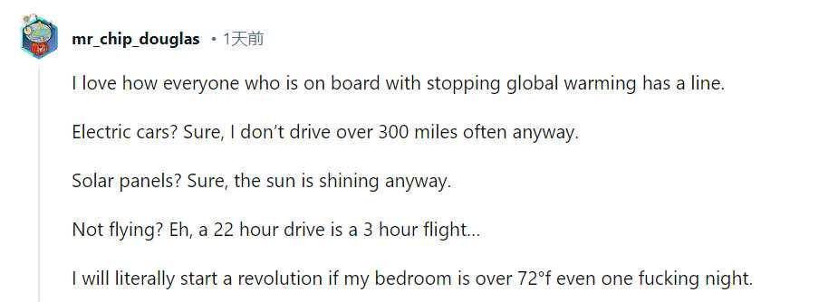 今年7月,第33届夏季奥运会就要在巴黎开幕了,各项准备工作都已进入最后阶段。 每个城市都想抓住机会,把奥运办得有特色,巴黎也不例外,他们这次的一大重要特点就是“环保和可持续”,想办一届“绿色奥运会”。 (巴黎奥运会) 之前就有消息说,为了吃的更环保,巴黎奥运会食堂准备了520道菜,以满足各国运动员需求。 但其中60%都是素菜,就连蛋白质都来自植物蛋白,无论是谁都得“吃草”。 (巴黎的素食菜肴——燕麦藜麦冷麦片) 法国老百姓自己吃肉,但偏偏要劝运动员们吃素,毕竟这样才更环保。 (相关报道) “吃”方面已经让人很担心了,而巴黎政府最近又放大招,要让运动员们住的也“更环保”。 做法很简单,让运动员的房间都不装空调 去年的天气数据表明,2023年是欧洲夏季气温最高的一年。 (相关报道) 根据预测,2024年欧洲夏天的气温可能会打破去年的纪录,人们又将迎来一个“苦夏”。 (最新预测) 就在这种形势下,巴黎市长安妮·伊达尔戈(AnneHidalgo)突然宣布,他们不打算给奥运村里运动员的房间装空调了,会用更环保的方式来降温。 这些方法包括—— 他们给这些建筑设计了一套地下汲水的冷却系统,安装在公寓的地板和天花板上,起到降温作用; 同时,他们精心设计了建筑朝向,让建筑外墙几乎不会受到阳光直射,减少热源。 巴黎奥委会表示,他们希望这届比赛的碳足迹能降至2016年里约奥运会和2012年伦敦奥运会的水平。 (巴黎市长伊达尔戈) 巴黎市长对这套设计很有信心, “这项设计的目的是避免使用空调,即使在非常非常高的温度下也适用,能保持舒适的温度。” 她强调要“相信科学”, “我觉得我们必须在两个点上相信科学。” “第一个是科学家说,在环保方面我们已经处于悬崖边缘。” “每个人,包括运动员,都必须意识到这一点。” “其次,我们必须相信科学家,他们能帮助我们用更清醒的方式盖楼,在没空调的情况下生活。” (相关报道) 巴黎市长对“绿色奥运”的理念很上头,但大部分网友都并不看好。 “我只记得1996年亚特兰大奥运会,当时佐治亚州非说他们那的夏季平均气温才72华氏度(约合22摄氏度),国际奥委会不知怎么,还真就信了。” “没错,结果办成一坨屎。因为当年气温高达91华氏度(约合33摄氏度)。” (截图来自Reddit@orrawitch) “我觉得每一个参与阻止全球变暖的人都应该有一条底线。 电动汽车?当然可以,反正我开车不会超过300英里。 太阳能板?没问题,无论怎样,太阳会照常升起。 不坐飞机?呃,22小时的车程,坐飞机只需要3小时。 如果我的卧室气温超过华氏72度(约合22摄氏度),哪怕只住一晚,我都会站起来革命的。” (截图来自Reddit@mr_chip_douglas) “我觉得这是一个策略,让运动员们睡不好觉,这样法国队没准能多赢几块奖牌。” (截图来自Reddit@dwbraswell) 其他国家也不吃这一套,毕竟住的好才能休息好,休息好才能成绩好,很多国家的代表团都担心没空调会影响运动员成绩。 澳大利亚、巴西、加拿大和挪威奥委会都有这样的担心。 挪威奥委会表示:“我们明确地希望所有房间都装空调。” 巴西说,在收到“高温预警”的情况下,他们有必要花钱为本国代表团租空调。 澳大利亚代表团表示,他们正考虑为运动员提供便携式空调,以便在天太热或身体不适时使用。 加拿大奥委会透露,他们会实施一系列降温补充政策,包括给一些运动员的房间安空调。 (夏天靠空调续命,示意图) 不过,也有一些国家愿意相信巴黎。 比如德国奥委会就表示:“过去几年,我们定期参观巴黎奥运村,觉得地板和天花板上的冷却系统足以满足气候需求。” “我们问过本国的各种体育联合会需不需要租空调,大多数都觉得用不着。” (巴黎奥运村) 面对很多国家的不信任、不买账,巴黎市长表示不会强迫他们必须怎样做。 “他们想干啥干啥,我不会‘让’他们怎样做的。” 奥运会结束后,奥运村将成为圣德尼、圣旺和利勒圣德尼(都位于巴黎郊区)老百姓的居民楼,为6000人提供家园。 “对我们来说重要的是这些公寓,这些新式建筑不需要空调,所以说我们的工作是长期的。” (巴黎奥运村效果图) 再过四个多月,巴黎奥运会就要开幕, “吃”和“住”都因为环保出现争议, 剩下“衣”和“行”,希望巴黎不要再出什么幺蛾子了