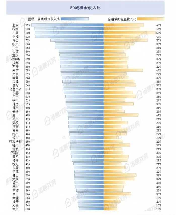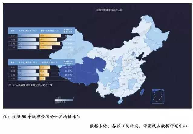 走进经济生活里的一切 导读:人们抱怨大都市租房难租金高,最直接原因是租金和收入的比例过高,房租收入比这一指标即是反映居民对房租的负担能力。 从租金收入比最高的10个城市来看,一线城市的高收入在高房租面前毫无优势。房租、收入双高,减去房租后的可支配收入寥寥无几。 “长安居,大不易”。虽是千年前顾况随口一调侃,却道出大城市居住的艰辛。安居弗易,古来有之,盛世滋生的人口给大唐带来的不仅是从未有的雍容大气,还有“城市病”,《旧唐书宪宗本纪》有记,当时宦官当中,有宅之人仅占36.7%,大城租房的人可不是少数。 时至今日,想要在大城市中拥有栖身之所更是困难。房价节节高企,租金亦水涨船高,年轻的漂一族想绕开房价大山,却又被租金遏住去路。 人们抱怨大都市租房难租金高,最直接原因是租金和收入的比例过高,房租收入比这一指标即是反映居民对房租的负担能力。而对于房产持有者来说,当前较低水平的租售比、租金回报率又让持有房产租赁在房产出售变现的巨大回报面前毫无竞争力。巨大的房产价值却缺少获取合理回报的渠道,这或许也是当前房地产市场面临的又一大挑战。 房租收入比直接反映居民租房压力。诸葛找房数据研究中心选取全国50个热点城市,以整租一居室价格作参考,绘制出全国租房压力地图。北、上、深三个深蓝色块分外显眼。 具体来看,在一线城市若想一个人整租一居室,房租占收入六成以上,北、上、深更是高达九成以上。即使是退而选择合租,在一线城市的租房成本也达到收入的30%以上。可怜漂一族,年纪轻轻,钱包就被房租掏空。 一、一线城市租金回报率均低于2% 珠三角宜居长三角宜租 房屋租售比是指每平方米使用面积的月租金与每平方米建筑面积房价之间的比值。 国际上用来衡量一个区域房产运行状况良好的租售比一般界定为1∶300~1∶200。 中国由于房价的高企,租金还无法追上房价上涨的步伐,一线城市的租售比已经小于1:600。 从全国大中城市租售比来看,在统计的66个城市中,北京排在租售比低阵营的TOP10里。前10中,三四线城市仅有2个,二线城市占到了70%。整体分城市等级来看,一线城市平均租售比为1:659,售租比达55年;二线城市平均租售比为1:551,如果房价不变,在二线城市收回买房成本的时间,比在一线城市缩短了9年;三四线城市虽然房价相对较低,但租赁市场需求更加薄弱,租售比略低于二线城市,为1:556。 一线城市中,北京租售比垫底,突破1:700。上海租售比最高,租金回报率高于1.9%。四个城市租金回报率均不到2%。房价、租金双高的深圳和双低的广州租金回报率均在1.8%-1.9%之间。 表格:一线城市租售比情况 在统计的全国大中城市中,二线城市的租售比也都较低,东三省省会城市排名靠后,主要是由于其整体房价较低,市场相对冷清,租售比相对较高。而长三角一带苏州、南京等这一轮房价上涨凶猛的城市,租金回报率都较低。 排名靠前和垫底的两座二线城市很特别:厦门和哈尔滨,也是意料之外情理之中。 哈尔滨受东北整体环境的影响,房价本身并不算高,4月二手住宅挂牌价为9715元/平方米,排在百城中的第35位。而哈尔滨作为省会城市,对区域内务工人口有较高吸引力,租赁市场相对活跃,租金相对较高,也就是说哈尔滨是租金高房价低的地方,这在全国大中城市中也比较少见。 厦门的租售比在所有城市里最低,租金回报率垫底,是唯一一个突破1:1000的城市,比一线城市更低。厦门房价的激昂上涨是有目共睹的,特别是岛上区域,4月全市二手住宅挂牌均价达49489元/平方米,已经超过广州,位居百城榜单第四位,平均房价仅低于北上深。但与之相反的则是租金的持续低迷稳定。 售租比的表现更加直观,直接推算购房出租回本年限。售租比越高,说明通过出租回本年限越长。绘制成全国地图会发现,东部地区一片深蓝(售租比高),东三省是仅存的清流。厦门的售租比高达89年,远高于以67年位居第二位的石家庄,相比仅25年回本的哈尔滨,如果房价不变,在厦门想要收回买房成本的时间比在哈尔滨整整要多64年。而将近30个城市售租比超过50年,北京则需要60年。 长三角内各城市租售比较为平均,但梯队分布也比较明显。苏州垫底,是经济圈内租售比唯一低于1:700的城市;泰州、淮安、盐城三个圈内房价垫底的城市租售比最高,租金回报率均超过2%;其他城市租售比差距均不大,大部分城市集中在低房价低租金回报区域,更适宜租住。核心城市上海、杭州在经济圈内租售比居中。总体而言,长三角经济圈内各城市发展较为均衡。 珠三角经济圈各城市租售比差异较大,两极分化较为严重:镇江、海口及广西地区租售比远高于其他城市;东莞垫底,租售比突破1:700。整体来看,珠三角经济圈租金回报率在2%以上的城市较多,大部分城市集中在低房价高租金回报区域,更适宜购房。深圳、广州、三亚由于房价较高,租金回报率在经济圈内处于相对低位。 二、入不敷出,收入上交房东 房租收入比直接反映居民租房压力,选取全国50个热点城市,以整租一居室价格作参考,绘制出全国租房压力地图。 北、上、深三个深蓝色块分外显眼,具体来看,在一线城市若想一个人整租一居室,房租占收入六成以上,北、上、深更是高达九成以上。即使是退而选择合租,在一线城市的租房成本也达到收入的30%以上。可怜漂一族,年纪轻轻,钱包