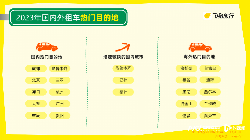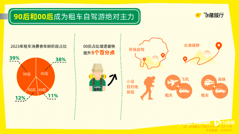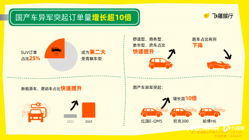 12月15日,在线旅行平台飞猪发布《2023租车自驾游报告》(以下简称《报告》)。《报告》显示,2023年国内租车订单量同比去年增长167%,较2019年更是增长超10倍,创下新纪录。其中,中秋国庆假期和双11当天分别创下年内假期预订峰值和年内单日预订峰值。 便利、灵活、私密,租车自驾在2020年后迎来快速增长,成为一大新兴旅游出行方式。2023年,随着常态化旅游需求的复苏,租车市场加速增长,跻身年轻人休闲旅游的主流选项。《报告》显示,2023年,90后和00后订单占比过半,是租车自驾游消费主力军。 据波士顿咨询预测,中国租车市场规模将在2025年达到1585亿元左右,年复合增长率约为13%。“拥有驾照的消费人群和租车市场规模的快速扩大,对平台和租车商家都是巨大的机会,国内租车行业正处于新的快速增长阶段。”飞猪用车业务负责人张烨表示,“这一阶段也是行业加速数字化、升级产品与服务的重要关口,飞猪希望利用在SaaS系统、产品创新上的效率优势,做好租车行业的‘服务者’。” 90后和80后占比过半 是租车自驾游主力军 2023年,国内租车市场消费人群结构进一步年轻化。《报告》显示,2023年,90后订单占比从去年的35%提升至39%,是租车自驾游主力军。00后占比增速最快,年内提升超5个百分点。90后和00后累计已占据租车消费群体的半壁江山。 年轻人的租车自驾游消费观念更追求多元和有趣,环线自驾、长途越野、小众目的地探险等方式受青睐,“飞机/高铁+租车”等兼具效率和自由度的组合方式也在快速增长。这带动了2023年租车自驾游消费内容和消费品质的升级,2023年,租车自驾游的人均消费同比去年增长约50%。 数据还显示,成都、乌鲁木齐、北京、三亚、海口、贵阳、杭州、大理、广州、重庆等是2023年租车热门目的地,乌鲁木齐、郑州、福州等目的地增速较快。 国产车异军突起 订单量增长超10倍 通勤要舒适,越野要拉风。《报告》显示,2023年租车订单中,SUV车辆占比大幅提升至25%,已成为经济型车辆之外的最多选择。舒适型、商务型、豪华型、房车型车辆的占比也在上升,跑车占比有所下降。 国产车异军突起。2023年租车订单中,国产车同比增长超10倍,红旗E-QM5、坦克300、哈佛H6是热门车型TOP3。其中,2021年上市的红旗E-QM5,仅用两年时间便跃升为最受欢迎的国产车,2023年的订单量同比翻了数番。新能源车、混动车的占比也在快速提升。 飞猪于2021年推出“安心租”标准,包含免费取消、车辆及违章押金双免等7项服务内容,2023年在部分城市又升级推出“飞猪心选”服务,消费者下单相应标识的车辆无需承担理赔范围内的全部车辆损失(含玻璃和轮胎)、停运费、折旧费等。《报告》显示,2023年“安心租”“飞猪心选”订单量同比2022年增长近2倍。 海外自驾游订单量增长超10倍 4万用户拿到“小白本” 租车自驾游从国内火到了海外。《报告》显示,2023年海外租车订单量同比去年增长超10倍,洛杉矶、普吉岛、曼谷、迪拜、墨尔本、悉尼、旧金山、兰卡威、伦敦、奥克兰等是海外租车热门目的地。 2023年618期间,飞猪联合租租车推出国际认证驾照翻译件(TIDL)服务,消费者可免费获得经9种语言认证翻译和海外官方机构认证的“小白本”——国际认证驾照翻译件,可配合中国驾照在法国、英国、德国、葡萄牙、西班牙、意大利、加拿大、澳大利亚、新西兰等热门目的地使用。该服务上线至今,已有4万名用户成功领取。 租车自驾游需求持续高增长,让经营租车的企业迎来长期利好。2023年,飞猪平台上有超七成的租车商家订单量同比翻倍增长。目前,飞猪租车吸引了超2000家租车企业入驻,提供近万款车型,租车服务覆盖全球200多个国家和地区。 采写:南都记者许琨