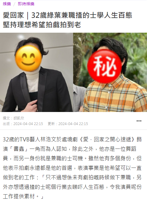 现年32岁的港星林浩文已经签约无线7年,他在《爱·回家之开心速递》客串“阿丛(书虫)”一角为观众熟知,至今出演了几十部电视剧,但微薄收入仍不足以维持生计。 据港媒4月5道,林浩文去年考了出租车司机牌照,开工第一天从凌晨4点开到下午5点,工作时间长达13个小时,如果想多赚一点钱,可以租全天的车,但需要连续开21个小时才划算,他本人之前曾尝试过,现在为了安全,还是选择有休息时间的档期。 林浩文港媒受访,被问到出租车司机的收入是否比TVB的高时,他表示“正常”,解释只要肯做还是可以“稳餐食”,TVB照常发工资,在加上出租车司机的收入,属于可养活自己的阶段。 林浩文或许是为了挽回一些面子,表示自己只是在没剧拍的情况下才开车,他开出租车的原因是想看看人生百态,为自己的演戏事业提供素材,不会放弃当演员。 事实上,林浩文是一位成熟的演员,15岁就开始学舞,2008年在TVB节目担任郭富城的伴舞,2017年进入TVB培训班,客串过《牛下女高音》《白色强人》《降魔的2.0》等几十部电视剧,这些电视剧在香港大火,但内地的收视率一般般,所以很多人并不认识林浩文。 TVB普通演员收入低是不争的事实,而老员工的收入其实也不高。 香港音乐人黎彼得,曾出演《唐伯虎点秋香》为大众熟知,他是一位才华横溢的音乐人,写下《卖身契》《Monica》等经典歌曲,两年前突然生病入院开刀,几十年的收入都交不起医疗费,结果TVB还让他“待业”,怕他在剧组再次出意外,“荷包见底”的黎彼得只能公开求助,后来还是富豪刘銮雄资助一年的生活费才度过难关。 TVB港姐冯盈盈,在公司也算是小花级别,每个月工资也才1.9万港币,甚至不如应届毕业生,她后来学会直播带货,瞬间打开新世界。 40岁的港星吴浩康在内地小有名气,入行22年的他,现在要在工地做建筑才足以维持生计。