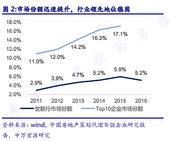 房租猛涨,资本凶猛。 今年以来,北京、深圳等城市租金涨幅已高达30-40%,群众继买不起房后,喜迎租不起房的时代。 8月,我爱我家副总裁胡景晖,炮轰蛋壳、自如等长租公寓运营商推高房租,揭开了大城市房屋租赁业为争夺房源,抢占市场份额的冰山一角。 房屋上涨的锅如果全丢给资本,必然偏颇,房租上涨的真正原因,应是多因素合力推动。 但行业老司机自曝家丑,至少说明这事不会是空穴来风。 鼻子灵光的资本们,一定在房屋租赁市场上,嗅到了钱的味道。 A股就有一家公司在不断加码房屋租赁业务:世联行(002285),最正宗的租售同权概念股。 1 去年今日,面对房价的狂飙猛进,政府高呼房住不炒,要让人民住的有尊严,采取了一系列措施,坚决遏制房价的上涨。 2017年7月17日,广州政府率先提出租售同权,网上一片欢呼。 一时间,租房者的春天似乎来了,早早布局房屋租赁业务的世联行也迎来了一波气势如虹的走势。 但一年以后再回首,世联行却只剩下眼前的苟且,诗和远方都没了。 不仅坐了一次过山车,还摔了个跟头。 最近租房市场的火爆再次引起了投资者的注意,在这个焦虑都可以贩卖的年代,高房价对社会经济的伤害已显而易见。 凡是过往,皆为序章。 炒房已不能兴邦,租购并举也应该两条腿都迈步了。 可预见的将来,租赁政策的暖风还会继续吹,是时候审视一下这头猪了。 1993年,世联房地产咨询服务(深圳)有限公司成立,主要从事与房地产相关的咨询、价格评估等业务。 此后,随着实力增强,开始从事新房代理销售业务,凭借先发优势,与万科、恒大、保利等龙头企业建立了牢固的代销关系。 2003年开始布局全国房地产市场,客户的房子修到哪里,世联地产就把销售队伍拉到哪里。 2009年,世联地产登陆深交所,成为国内房地产综合服务第一股。此后,借助资本市场的力量,收购和内生增长并举,几年时间里成长为国内领先的新房代销公司。 从QQ到微信,从BBS到微博,借助互联网的浪潮,一种全新的地产商业模式开始显山露水。 世联地产决心也让互联网+改变一下自己,2014年,开始实施“祥云战略”,探索O2M的商业模式,建立了B2C式的房源交互网站“房联宝”。 正如湘鄂情改名中科云网,多伦股份改名匹凸匹,世联地产觉得转型后,也应该取一个响亮的名字。 或许是脑洞不够清奇,他没有取世联互联或者世联互网之类霸气的名字,而是改名世联行。 此后,走上了多元化的发展道路。 2 转型主要方向即房地产电商,通过房联宝将新房交易的服务场景从线下延伸至O2O线上平台。 世联行最开始利用房联宝销售打折券从购房者手中获取信息服务费,举办网络及线下营销活动安排看房团,成交后向开发商收取佣金。 随着线上实力增强,世联行逐渐采取营销总包模式,除整合客户外,还对广告投放、现场活动等环节进行整合,有效地提高单客价。 这种以大数据为支撑,移动互联为终端的业务模式,使公司线下庞大的专业销售团队资源得到充分的利用。 同时世联行在B端和C端积累的庞大资源也有了变现的渠道,房地产电商项目发展迅速,很快成为了公司的主要增长点。 2017年互联网+业务实现营业收入23.53亿元,4年的年均复合增长率达到225.87%,占营收的比重也上升到28.65%。 世联行的互联网+业务由于前期投入较大,毛利较低。 但由于与公司的代理销售业务互补,同时实行的是营销总包模式,毛利率得以稳定提升。 随着互联网+业务投入的降低,进入稳定发展期后,规模效应下,世联行的盈利能力有望进一步提高。 业绩的稳步增长的同时,世联行也积累了丰富的资源,借助房联宝完成了186个城市的服务布局,对接的供应商超过2万家,链接的经纪人超过50万。 现有的营收规模仅次于房天下,短短4年成绩斐然,以现有成长速度,未来要看房联宝。 电商平台发展的如火如荼,世联行的新房代销业务也用强劲的表现证明了自己的主营地位不容动摇。 近十年来,房地产无疑是中国发展最快的行业之一,伴随着规模的迅速扩大,一干房企赚的盆满钵满,世联行也享受到了这种稳稳的幸福。 新房代销行业市场集中度很低,2015年TOP10企业的市场份额仅为17%,世联行作为行业龙头,市场份额也很低。 但世联行发扬了愚公移山的精神,一点点的把市占率提高到了5.2%,虽然2016年同比有所下降。 但那是因为公司把重心放在线上业务的所致,同时,也有一部分线下业务导入线上。 据申万宏源地产测算,2016年的线上销售额为2000亿,如加上线上代销业务,世联行的市场份额应为7%左右。 虽然市占率低,但与两个竞争对手相比,世联行可是相当有底气,销售额增速最快,规模也领先一个身位,行业龙头地位稳固。 近两年,一线房企加快在三四线城市的布局,市场份额不断提升。 2017年TOP20企业的销售占比已达到29.5%,同比提升8.4个百分点。 从整个代销行业的情况来看,新房在一线城市的火爆不必赘言,普遍都已实行摇号,不少房企逐渐转为自销,蚊子再小也是肉。 在三四线城市,由于市场景气度不如大城市,更多的房企还是相信术业有专攻,世联行的布局无疑具有前瞻性,早已把渠道下沉到三四线城市。 现在世联行三四线城市的营收占比已超过一半,而这也将是世联行代销业务的主战场。 今年以来,随着国家信贷收紧,房地产大受影响,特别是一线城市。 随着一线房企加快三四线城市的布局,世联行依托与万科、恒大等企业的良好合作关系,受影
