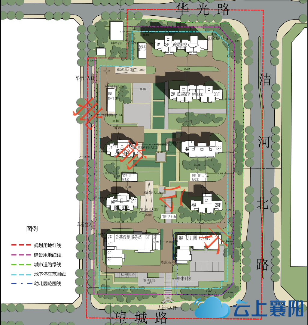 近日,襄阳市自然资源和规划局对襄阳市高新租赁住房项目建设工程设计方案总平面图进行了批前公示。 公示透露,襄阳市高新租赁住房项目位于华光路以南、余虹路以北、清河北路以西、樊宛路东侧。2020年4月,襄阳市住房投资有限公司取得了该宗划拨居住用地的不动产权证。该项目经市住房领导小组批复纳入租赁性住房建设计划。 依据建设单位提供的建设工程设计方案(由襄阳市城市规划设计研究院设计),这次建设内容包含6栋(25-33层)高层住宅、1所6班幼儿园、1栋公服配套楼(包含社区办公、社区医疗、老年日照、社区文体)及相关附属用房。经核算,本次建设工程设计方案总建筑面积约130214㎡,其中地上计容建筑面积约94200㎡、地上不计容架空层约1370㎡、地下建筑面积约34644㎡。经日照分析,该项目对外无日照影响,对内共有55套存在日照影响(详见附件),建设单位承诺在选房时将日照情况告知选房者并纳入选房合同。 该项目建设工程设计方案经襄阳市自然资源和规划局业务会研究同意,建筑间距和建筑退让满足消防及技术规定要求,地下室按市政府专题会议要求,仅满挖一层可配建停车位942辆(比规范少配建258辆),不足停车位数免于配建。 根据相关规定,现对该项目进行批前公示,公示时间:2021年1月5日至2021年1月14日。市民如有意见,可向襄阳市自然资源和规划局建设工程管理科反映。 网站: 邮箱:xiangyangghek@163.com 联系地址:襄阳市高新区中原路22号襄阳市自然资源和规划局 邮编:441003 联系科室:建设工程管理科