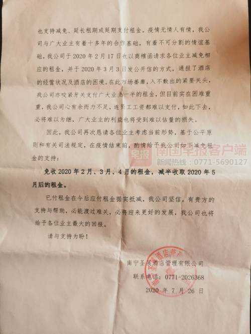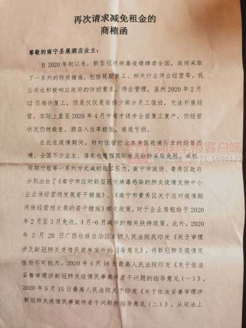 10多年前,南宁圣展独立公社(以下简称“圣展公社”)A座的数百名业主,将房子租给南宁圣展酒店管理有限公司(以下简称“圣展酒店”)用于客房经营。今年7月,业主收到酒店商榷函,称因疫情影响请求减免租金;业主们不同意酒店单方减租,之后再没收到租金。对此,酒店表示,目前因经营困难暂时拖欠租金,建议业主提前中止房屋租赁协议,双方更改合作方式。 业主:酒店单方要求减租,拒绝者停付租金 吴先生说,10多年前,他购买圣展公社A座的两间公寓房。2006年3月,他与圣展酒店签订《房产租赁协议书》,以2300多元/月的价格将两间房租给对方用于经营,租期至2021年8月底。 业主吴先生与酒店签订的房产租赁协议。 据吴先生介绍,今年7月,圣展酒店以疫情为由,向业主发了一封减免租金商榷函,恳请业主同意免收2月、3月的租金,减半收取4月至6月的租金。大多数业主不同意减免租金,找到酒店负责人要求履行协议条款,及时支付租金,“我们的房子都欠了贷款的,银行也不会同意减免”。 多名业主告诉南国早报客户端记者,圣展酒店随后召集业主代表开会协商如何支付租金。在会上,酒店方未明确房租支付时间,但提出新的合作方式建议:由业主将房产委托酒店经营管理,“双方同担责,共进退”。不过,双方未达成一致意见。会后不久,酒店方再次发函或分别致电业主,称如果不同意减免租金并更改合作模式,8月15日起开始“封房”暂停经营,当日起停算租金。此后,未签字同意减租的业主,再收到过任何租金。 吴先生说,今年下半年各行业都恢复了常态,疫情对酒店业的影响已经不大,业主认为酒店以“疫情”为名恶意欠租。目前,已有50名业主联名起诉,法院已受理。 圣展酒店发布的减免租金商榷函。 酒店:经营困难暂拖欠租金,建议业主更改合作方式 12月24日下午,圣展酒店执行总经理张先生对南国早报客户端记者说,酒店有近500间客房,2006年跟业主签约以来从未出现过拖欠租金的情况。今年初,受新冠肺炎疫情影响,酒店一度暂停营业,后期恢复正常营业后生意惨淡,每月严重入不敷出。下半年,酒店入住率还是无法回归正常状态,导致资金周转困难,无法按时向业主支付租金。 圣展酒店。 张先生表示,虽然亏损严重,前5个月未发员工工资,但酒店方还是积极筹措资金,优先支付业主一半的租金。无奈酒店经营颓势短期内难以扭转,于7月再次向业主发出商榷函,请求业主参考国家相关政策,减免疫情期间的租金,但没得到支持。 “是否愿意减免租金不强求,对于不同意减免的业主,我们没说不付租金,只是暂时先欠着。”张先生说,在协调会后,只有少数业主同意减免租金,酒店如约支付了相应月份的租金,也有10多名业主终止合作,将房屋回收自行打理。 业主与酒店的租金纠纷矛盾是否无解呢?对此,张先生说,酒店方与业主还剩下八九个月的租期,他提出了中止现有协议、变更合作方式的建议:酒店由“保底”的承租方变成“管家”,业主可集体或单独委托酒店进行经营管理,房屋经营所得租金扣除相应的成本以及管理费后全部归业主所有。 “业主最好提前把房收回去,及时止损,如果他们打算重新引进其他公司来经营,我们也不阻拦。”张先生表示,对于欠款的支付时间,商榷函里也明确了,从2021年4月起分期支付,至2021年10月前完成支付。 律师:酒店有义务交租,业主可打折收取 南国早报客户端记者注意到,受疫情影响,今年2月18日,自治区国资委出台减免商贸服务企业生产经营用房租金的细则。一个月后,南宁市发展和改革委员会、南宁市商务局联合发布致业主(房东)的减租倡议书,呼吁广大经营用房业主(房东)进一步支持中小微企业、个体户发展,渡过难关,尽力减免一定的房屋租金,并承诺县区、开发区将给予一定的财政补贴。 除了圣展酒店,早在2月,就有其他酒店向业主发函请求减免租金,但业主并不“买账”并在网上向南宁有关部门投诉。对此,中共南宁市委办公室回复称:酒店与业主签订的《房屋租赁合同》中,双方已就租赁物业的租赁期限、不可抗力等内容达成协议,大部分业主对减免租金表示理解,但仍有小部分业主不同意减免。如业主与该公司无法达成共识,建议依据合同向南宁市仲裁委员会申请调解,或通过司法途径维护自身合法权益。 因疫情影响,酒店要求减免租金的要求是否合法、合理?南国早报南国法援律师麦鹰雄认为,酒店与业主签订了协议,在约定期间都需履行支付租金义务。不过,新冠肺炎疫情被认定为突发公共卫生事件,租金是否可以调整,以及如何调整,不仅需尊重当事人的意愿,还要从实际情况进行考量。 “如果因疫情防控需要,酒店被有关部门采取强制措施停业,造成直接损失,那可以主张减免相应租金。”麦鹰雄说,新冠肺炎疫情的发生可认定属于不可抗力,但如果有关部门只是提倡、建议减免租金,酒店仅因客源减少、收入降低,就要求业主减免租金,理由不够充分,“可依据公平原则,酌情调整租金,业主打折收取。” 本文由南国早报原创出品,未经许可,任何渠道、平台请勿转载。违者必究。