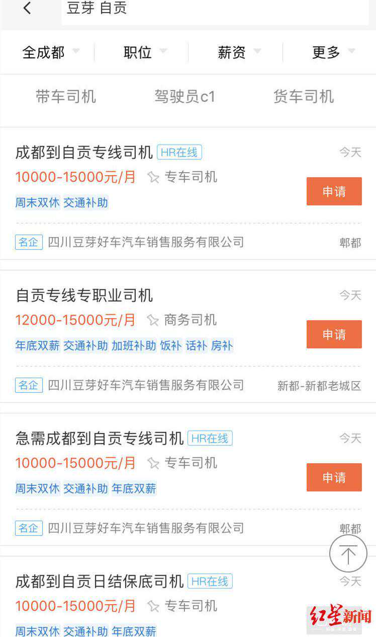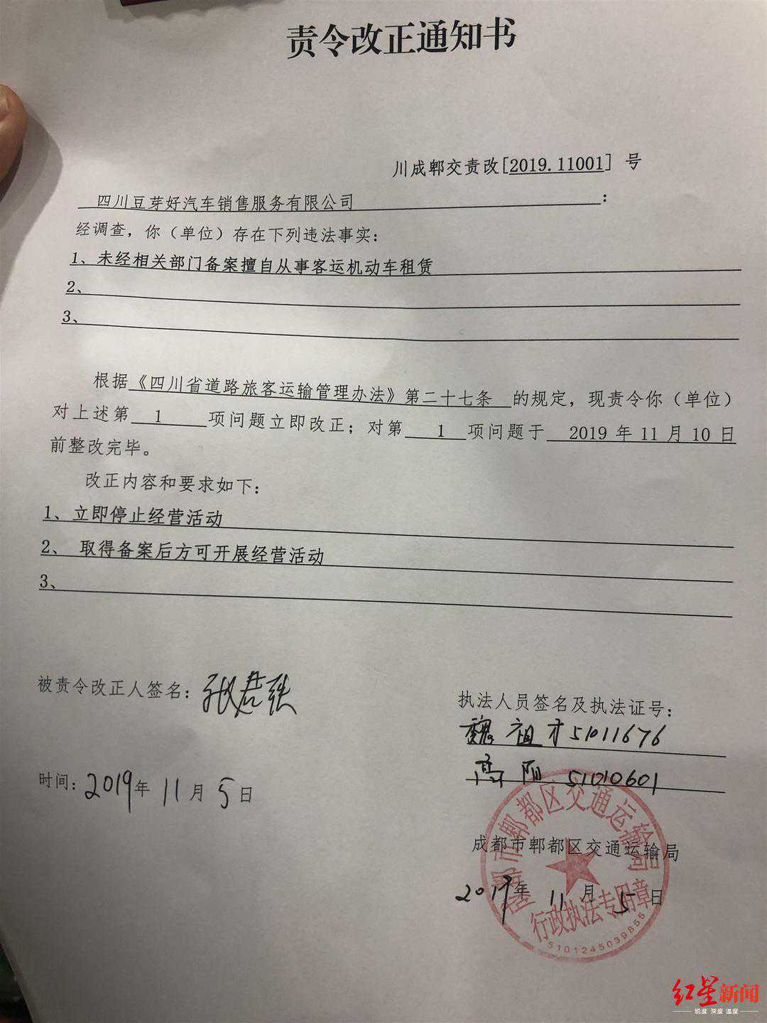 由专门的人负责找客源,按照地址接上乘客之后,进行现金支付,然后把乘客从成都拉到自贡。今年10月下旬,冯小华通过四川豆芽好车销售服务有限公司一条“成都到自贡专线司机”的招聘,在该公司以租代购买了一辆小汽车,经过该公司的安排,在线下揽客收费,进行运输。但跑了3天,就被执法部门查处。 豆芽好车汽车销售公司 和冯小华一样,为了跑这条专线在该公司购车的司机们这才发现,公司所称的专线,竟然是赤裸裸让他们去违法。近日,红星新闻记者对该汽车销售公司进行了暗访,揭开公司与黑车串串勾结的内幕。目前,该公司已被成都市郫都区交通运输管理部门要求停业整改。 公司招募城际专线司机买车后才发现是非法营运 10月23日一早,和前两日一样,冯小华在微信上接到了专人发送的4名乘客信息,他驾车在成都依次接上乘客后,经成自泸高速前往目的地自贡,在自贡北收费站下了高速,被一位运管执法人员叫停下来。“执法人员问我和车上的人是什么关系,是不是在拉客,我说我们是公司在跑专线。” 执法人员二话没说,让冯小华出示车辆行驶证,车辆性质一栏显示为:非营运。解释再多都没用,乘客下车解散,冯小华交出汽车。 豆芽好车汽车销售公司行驶证上车辆性质为非营运 现场执法的四川省高速公路交通执法第四支队执法人员,向冯小华出具了行政强制措施决定书,因车辆没有营运证又无法当场提供有效证明,对车辆实施强制扣押。 冯小华却表示,该车是在四川豆芽好车汽车销售服务有限公司以租代购买的。“当初是看到该公司招成都到自贡专线的司机,然后就以租代购买了这辆车,公司说这条专线可以跑,乘客都是专门有人安排的。” 冯小华被扔在高速路口,打电话给卖车的公司和提供客源的人,都解决不了问题,“后来自贡这边一位拉客源的人来接到我,还喊我不要把他供出来。” 冯小华的车被扣押之后,同在“豆芽好车”以租代购买车跑成都到自贡专线的司机们,也纷纷停下了这趟业务。 红星新闻记者随后找到了6名与冯小华情况类似的司机,从他们与豆芽好车公司签订的《汽车购售合同》上看,车辆性质属于“营运”。事发后,司机将矛头指向了卖车并承诺这趟城际专线合法的四川豆芽好车汽车销售服务有限公司,“当初就是冲着这趟专线去买车的。”那么,事实是否真如司机们所说这样,“豆芽好车”所谓的成都到自贡的专线,到底是否合法? 买了车就可跑城际专线驾龄不够、黑户都可以做 成立于2018年2月的四川豆芽好车汽车销售服务有限公司,于成都金牛区登记注册,两个办公的地点均在成都郫都区,经营范围除了销售汽车,还包括网约出租车。 红星新闻记者发现,该公司在58同城上发布了很多招募司机的信息,其中有多条“成都到自贡专线司机”,月薪1万到1万5。 豆芽好车汽车销售公司在网上发布的成都到自贡专线司机招募 红星新闻记者以求职者名义,进入了该公司天河路的一个办公地点咨询。接待红星新闻记者的公司两位工作人员表示,客户可以以租代购的方式,在公司获得一辆汽车,然后公司帮司机安排各种网约车平台,让司机跑网约车,同时也可以安排机场专线、成都到自贡的专线等。 对方提到,成都到自贡的专线是线下的,每天调度会通过微信和短信的形式,“这条线路跑了很多年了。” 在豆芽好车公司提供的购车名单上,甚至还注明了“驾龄不够、黑户都可做,需签不跑车协议”。事实上,此次维权的6名司机中,有两名司机的驾龄就没有达到规定的3年以上,但当他们提出买车跑专线客运时,豆芽好车公司竟然把车卖给了他们。 豆芽好车汽车销售公司购车名单上标注:驾龄不够,黑户都可做 司机明航告诉记者,驾龄不够的,都被豆芽公司要求签署了一个豁免责任的协议,意思大概是说自己驾龄不够,如果去跑网约车,被抓了,后果自己负担,与他们无关。“当时我就问他们,如果我跑自贡被抓不,豆芽方面说,自贡专线不属于网约车,不违反协议内容。” “需缴纳8000元加盟费,专线是合法的” 红星新闻记者了解到,这条所谓的“成都到自贡专线”,每位司机都能得到每天一趟往返的保证,来回满载共8名乘客,每名100元车费,客源方没有找到8名乘客,会有补贴,保证司机每天最低收入700元。 根据豆芽好车公司提供的购车名单,红星新闻记者发现同样的车在该公司以租代购,至少比在4S店贵两万元左右。无需首付,但前期需一次性支付车辆保险等费用。 在买车之后,会和公司签订一份租赁协议,然后缴纳8000元加盟费,并且每月还要缴纳2000元服务费。 在暗访期间,豆芽好车公司工作人还员告诉红星新闻记者,成都到自贡的专线是合法的,并且所有证照都是齐全的,而汽车的行驶证上标注的车辆性质,都是营运车辆,很显然,这与冯小华车辆行驶证上的“非营运”完全不一致。 那这种以城际专线为名,实际让司机们去铤而走险的业务,又是如何操作的? 豆芽公司只管卖车黑车串串负责帮司机找乘客 红星新闻记者进一步了解得知,司机在豆芽好车以租代购获得车辆之后,会和所谓的“自贡的一家公司”签一份加盟协议,由自贡的公司为司机找乘客,而司机的8000加盟费,每月2000元服务费,都是交给自贡的公司,所谓的每天700保底,也是由自贡的公司在负责。 根据豆芽好车工作人员的这些介绍,红星新闻记者发现豆芽好车公司把车辆出售之后,跑该专线后续的事宜,