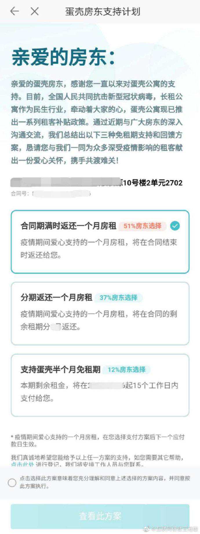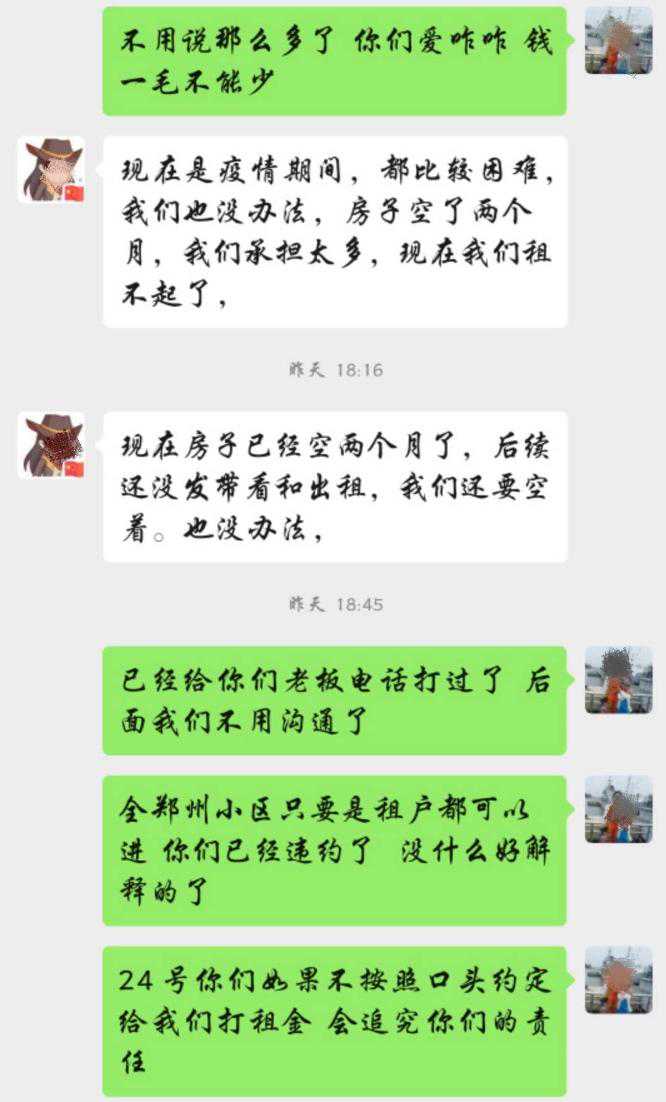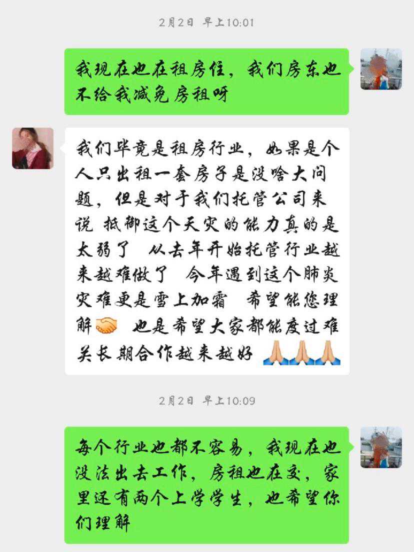 最近,郑州市民赵女士遇到了一件烦心事。她的一套房子一年前交给托管公司出租,约定托管期限为2年。近日,托管公司以“众志成城,共抗疫情”为由,提出希望赵女士减免30天房租。赵女士未同意,托管公司随后表示,不减免房租不再勉强,但租客也退租了,不再托管她的房子,提前解约。赵女士认为,托管公司属于违约行为。 受疫情影响,不少租客无法及时返城,还有个别租客出现返城却进不了小区的现象,而托管公司根据以往经验,年前囤积了大量空房等待节后的租房“小阳春”,不料一场突如其来的疫情导致租房市场一度将至“冰点”,出现近一个月的“空窗期”,谁该来为此买单? 【事发】以“共抗疫情”为由,托管公司与房东协商免30天房租 如果没有2月2日这条突然发来的信息,宅在家中多日的赵女士,原本2月12日会有一笔房租到账。 “众志成城,共抗疫情。亲爱的房东您好,我是您锦绣江南14-4-4房屋的房管负责人,首先祝您及家人新年快乐!因冠状病毒引起的特殊社会情况,造成学校、企业司延迟时间上班,因此呼吁业主您慷慨30天空置期(2020.1.31-20202.29这30天不计房租),如果疫情情况严重再议!疫情面前,大家共同努力,各出自己绵薄之力!我们也将采取利好措施留住租客、照顾好他们,对房间进行打扫、消毒、清运垃圾、保证水电、尽最大努力维护生产,让业主您安心。同仇敌忾,共渡难关!等您批复。” “我不同意。”赵女士告诉记者,她本人也在租房子住,她的房东并没有给她免房租;每个行业都不容易,但疫情期间,她也不能出去工作,家中还有两个孩子在上学,所以房租对于她来说,算是一笔支持家用的收入。 随后,托管公司员工给她发来了万达给商户免1个月租金、郑州某汽配城给租户免租金的新闻截图等信息,并发来了部分房东同意减免30天租金的微信对话截图。 “这不是逼迫我减免房租吗?好像别人都减了,我要是不减就特别没有觉悟。”赵女士告诉记者,她本人疫情期间也有看新闻,但对于个人来说,减免与否要视自身经济条件而定,国家没有政策明确个人作为房东要给租户减免房租。“我作为个人没有义务替托管公司节约成本。” 随后,托管公司提出退一步,减免15天房租,赵女士仍然没有同意。 【进展】不同意减免房租就“解约”? 赵女士告诉记者,双方交涉的房子户主是她丈夫,位于郑州市二七区,面积比较大,有155平米。2019年2月18日,她以委托代理人身份,与河南尚正居房地产营销策划有限公司签订了授权委托书。他们夫妇委托该公司全权办理房屋出租事宜,代理期限为2019年2月22日至2021年2月21日,房租按季度提前10天打给房主。值得注意的是,合同约定,甲方每年让出30天作为乙方的接洽承租工作期,也就是说,按照合同,赵女士原本就会给托管公司免1个月房租,一年只收11个月的租金。 2月12日,是按照合同应当打房租的日子。但赵女士并没有如期收到房租。对方回应:公司财务原定2月10日上班,但办公楼不让进,所以仍无法办公。赵女士明确表示,应当按照合同约定按时打房租,否则就要收回房子。 2月20日,另外一名工作人员主动添加了赵女士的微信,表示:因为疫情造成的影响,属于不可控因素。房东不愿意减免房租也不再强求,房子的租户表示不在房子里居住了,到期会直接搬走,解除合同。“我们这边的话到时候会直接把房子退给您。” 赵女士觉得对方“不诚信”,看到行情不好就抽身退房。按照合同约定的违约责任,委托期内,乙方(尚正居)提前退租的,应当赔偿2个月租金作为违约金;反之,甲方(赵女士)提前收回房屋,也要赔偿乙方2个月租金作为违约金。“他们这就算违约吧?” 【现象】托管公司遇困,节后租房“小阳春”变“冰点期” 赵女士与托管公司的矛盾,只是受疫情影响引发的众多问题中的一个小小侧面。长租公寓、托管公司,在疫情的影响下,似乎迎来一次前所未有的考验。向房东寻求暂缓房租、减免房租的支援,并非赵女士托管公司这一家。 前不久,管理接近50万间公寓、业务遍布多个城市的蛋壳公寓要求房东减免房租在网上引发风波。2月3日,蛋壳公寓发布了补贴租客的政策,但随后曝出,蛋壳也在要求房东免租,且未经协商。广大业主组建了维权群向蛋壳“开火”。2月17日,蛋壳公寓发表了“致广大房东的真心话”,坦言:“坦率地说,长租行业在此次疫情中遭受了非常严重的冲击。”“这次向房东寻求的免租期爱心支持,我们用于对租客进行补贴:如果我们倒下了,未来伤害的将是各位房东和广大租客的长期利益。”随后,蛋壳公寓提出了更为细化的房东支持计划:1、合同期满时返还一个月房租;2、分期返还一个月房租;3、支持蛋壳半个月免租期。 24日,记者联系上了与赵女士对接的托管公司司姓负责人,该负责人介绍,原本年后是租房高峰期,所以年前公司囤了一批房,本来原定大年初四上班,没想到遇到了疫情,至今还没有正常开工。新租客找不到,部分老租客也回不来,纷纷提出解约。最近2个月一直在亏损,未来一段时间预计郑州小区还会继续管控,无法带租客看房,所以才与房东商议减免房租。 要求房东减免房租,同意的多吗?该负责人表示,有同意的房东,但绝大多数也不同意减免。赵女士的房子刚好满一年,5户租户中有3户表示不再续租,所以公司也没办法弄,只能与赵女士商议房子托管公司不再续租,那两个续租的租户可留给赵女士。 【政策
