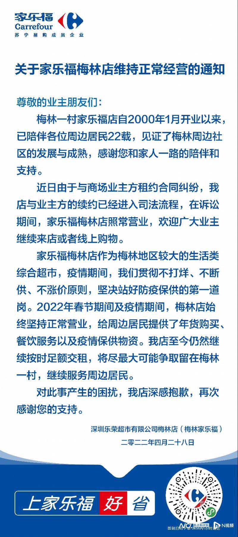 南都湾财社讯记者陈盈珊开业22年的深圳梅林家乐福或因与业主的续租纠纷面临停业。南都湾财社独家获悉,停业后场地将由茂业入驻运营。就梅林家乐福续租纠纷及场地后续运营问题,业主方深圳市人才安居集团称,涉及诉讼均已正式立案,正等待开庭。 物业方发布公告称租约到期将停业 梅林家乐福表示续租存在纠纷,诉讼期内将正常营业 此前,南都曾报道梅林家乐福将面临停业。4月28日,深圳福田梅林一村曾发布物业公告,通知家乐福梅林店因租约到期,将于2022年5月6日停业。落款为深圳市万厦居业有限公司梅林一村管理处,而公告起因是接到来自深圳市人才安居集团有限公司下属公司深圳市房屋租赁运营管理有限公司的通知。 物业发布的公告 同日,家乐福梅林店发布公告,称开业至今22年的门店,将在诉讼期间照常营业,欢迎广大业主继续来店或者线上购物;且强调,门店至今仍继续按时交租。而“诉讼期”一说,根据此前南都采访,家乐福相关负责人回应称门店与商场业主方存在续租纠纷,家乐福坚持正常营业,业主方准备强制收铺,也由此产生法院诉讼。 续租纠纷因何而起?租约到期后,超市变百货,如何保证及提升居民辖区服务质量?针对以上问题,业主方深圳市人才安居集团有限公司下属公司深圳市房屋租赁运营管理有限公司做出回应。 续租纠纷因何而起?业主:已公开招标,茂业将入驻 根据物业方告示,位于梅林一村附近的家乐福梅林店租约已经到期。目前,根据业主方深圳市房屋租赁运营管理有限公司回应称,关于家乐福梅林店暨乐荣超市的租赁合同,存在两个诉讼。 业主方表示,乐荣超市的租赁合同期限已于2021年3月31日届满,因家乐福超市体量较大,为配合乐荣超市妥善安置员工,清理货品,实现平稳过渡,安居集团已连续两次给予乐荣超市延长搬离期限,截至2021年12月31日止。 两次搬离期届满后,安居集团依照双方租赁合同的约定及国资委的政策要求,对涉案物业采取公开招租方式重新招租,乐荣超市也安排关联公司参与竞租。根据公开招租规则,由茂业公司得分第一中标,安居集团与茂业公司签订了合法有效的租赁合同,安居集团需要履行向茂业公司交付租赁物业的义务。 由此,2022年1月29日,安居集团向深圳市福田区人民法院提交起诉状等材料,诉求家乐福返还物业、支付占用费,乐荣超市单方强行支付的所谓租金已在占用费中抵扣。 不过,就安居集团起诉乐荣超市返还租赁房屋及支付占有使用费,家乐福并不认可。在安居集团起诉前,2021年年底乐荣超市就以安居集团侵犯其承租人同等条件下优先承租权为由提起诉讼,诉求继续承租使用涉案物业。 目前,两起诉讼均已正式立案,择日开庭。 同日,家乐福梅林店发布公告回应。 梅林片区,作为深圳的老社区,集合着梅林一村、富胜花园等居民小区。得知陪伴二十余载的家乐福超市即将关门,不少消费者留言表示不舍。 “梅林一村、下梅林就这么一个大型超市,没了也就是不方便了。今年还去过几次,二楼和一楼的商铺,除了药房和珠宝还开着,其他的基本上都关门了,明天准备再去看看,满满都是回忆。相较于其他的精品超市和大卖场,家乐福的商品更低价亲民。”一位消费者如是留言。 除了离各大居民区很近,门店不远处则是梅林水库。有消费者表示,自己虽然搬离了梅林片区,但是依旧会前往梅林水库绿道登山赏景,而每一次前来都会在家乐福采购简单的饮料零食,没想到竟然要结业了。 部分消费者留言 根据安居集团的说法,乐荣超市即家乐福梅林店所处的地块,目前为国有资产收归集团管理。所以,按照相关管理法规,同时也为了进一步对场域进行升级利用、更好服务辖区居民,已经进行了公开招标,确认接下来将由深圳人熟悉的茂业入场运营。 而茂业,此前给深圳人的运营印象,更多停留在百货上。在社区已有成熟的购物中心,且缺乏大型超市的基础上,招标茂业入场,当时是否有具体的场域规划考虑?新招入驻的茂业,是否将设超市,又将如何提升社区居民服务质量?就此,南都湾财社记者向人才安居集团查询,不过截至发稿前暂未收到有关情况的说明。
