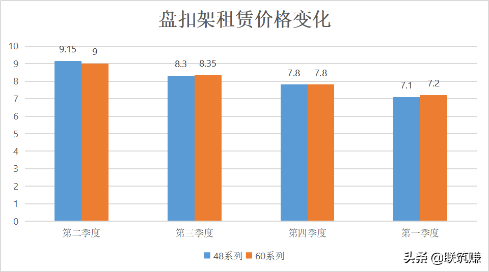 在建筑业整体繁荣增长的同时,盘扣式脚手架市场也随之迅速发展。根据相关数据收集,去年盘扣架价格在11月处于近几年来的历史高位! 尽管在12月,盘扣架价格迎来小范围的回落,但是总体依然保持高位。那么盘扣架租赁价格是否同样受到原料价格波动,我们收集相关数据,为大家简单分析一下。 盘扣架租赁费用组成 1、变动费用:脚手架搭设体积(材料的租赁费用)、工期(人员看管费用) 2、固定费用:搭拆人工费用、材料运输费用、机械使用费、交通费; 3、管理费:专业承包公司管理费用; 4、利润:专业承包公司利润; 5、税金:专业承包公司所得税等。 根据收集相关数据统计,盘扣架市场租赁价格参差不齐,不同地区、不同规格对应价格有涨有跌,具体的价格可以在联筑赚平台咨询,或者咨询小赚赚。 盘扣架租赁价格变化 以杭州市建筑设备租赁商会给出的参考价格为例,2020年第二季度时,48系列市场租赁价格一般在9.15元/吨/天;60系列市场租赁价格一般在9元/吨/天;2020年第三季度时,48系列市场租赁价格一般在8.3元/吨/天;60系列市场租赁价格一般在8.35元/吨/天;2020年第四季度时,48系列市场租赁价格一般在7.8元/吨/天;60系列市场租赁价格一般在7.8元/吨/天;2021年第一季度时,48系列市场租赁价格一般在7.1元/吨/天;60系列市场租赁价格一般在7.2元/吨/天。 怎么选择租赁还是采购 现如今,盘扣脚手架市场不断升温,很多生产厂家及专业脚手架分包商开始有所行动,导致市场价格参差不齐。面对这样的情况,大家有想租赁的,有想采购的,还想找专业分包的,到底该怎么选择? 这和项目对盘扣架的需求量以及使用时间有关。租用量越大,租期越长,那么平均每吨的租赁价格会相对便宜;租用量少,租期短,平均每吨租赁价格会相对高点。 综上所述,到底该选择租赁还是采购,还是有工期决定的。但是不论是租赁还是采购,大家一定要注意盘扣架质量,找到一家规模大且品牌度高的厂家很重要。 联筑赚平台已有大量优秀商家入驻,想选购靠谱商家的用户们,可以在平台选购,避免在选购过程中遇到各种问题。