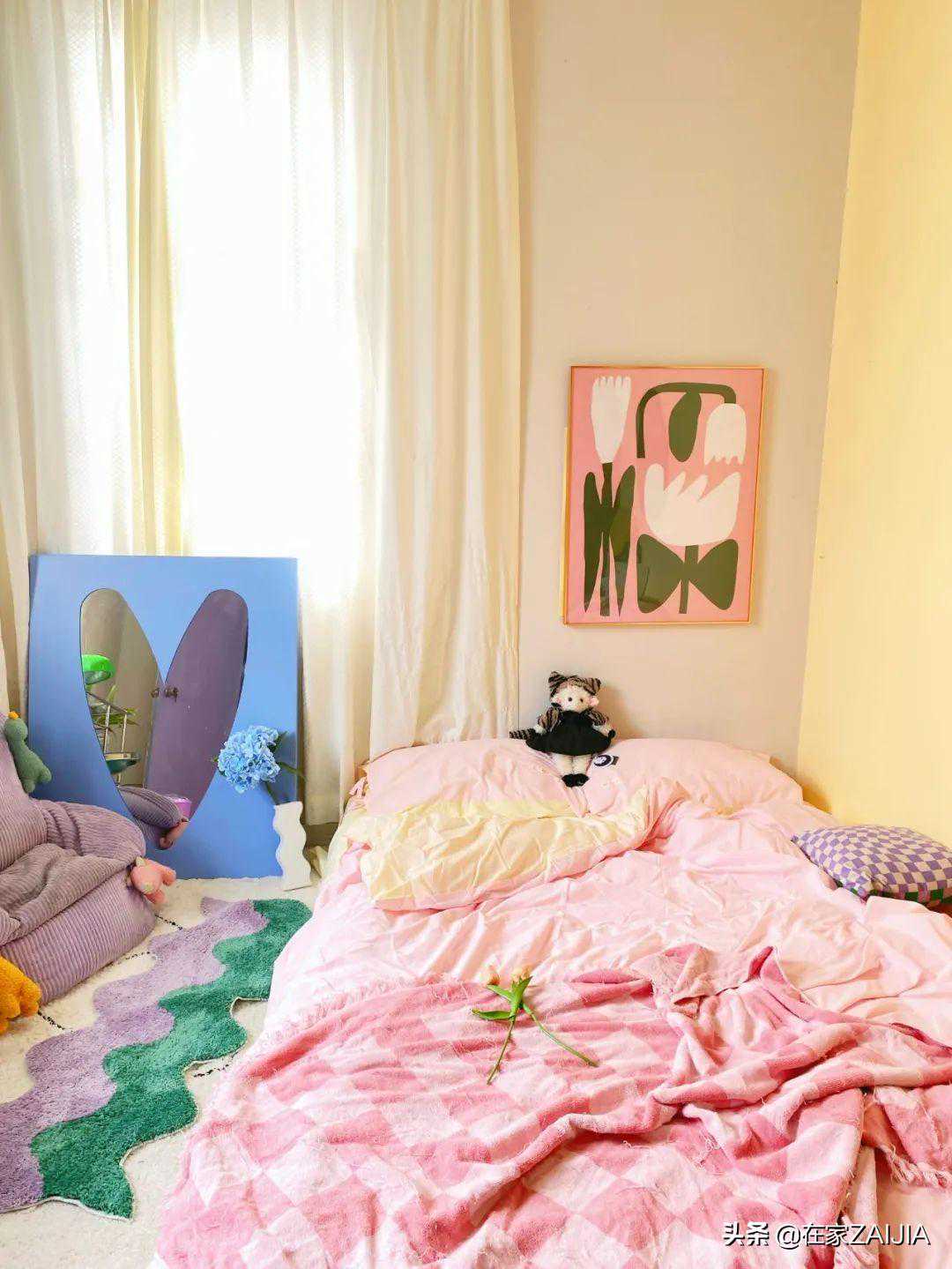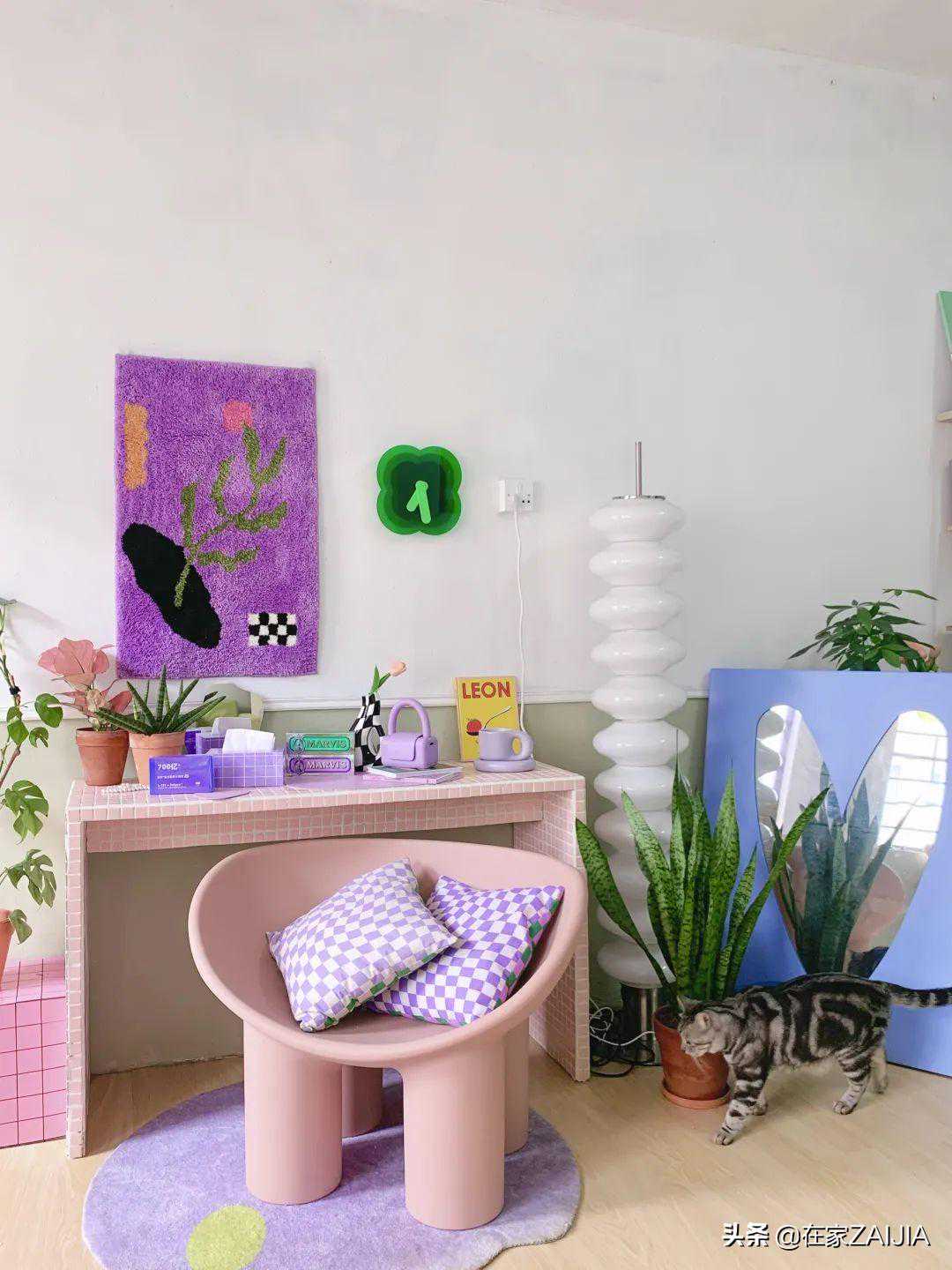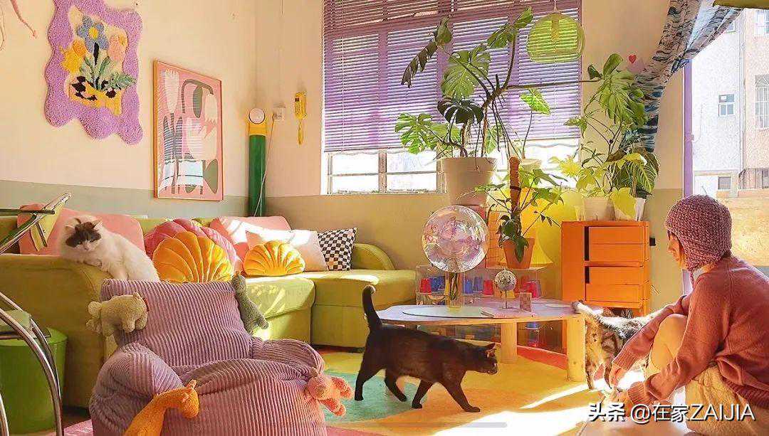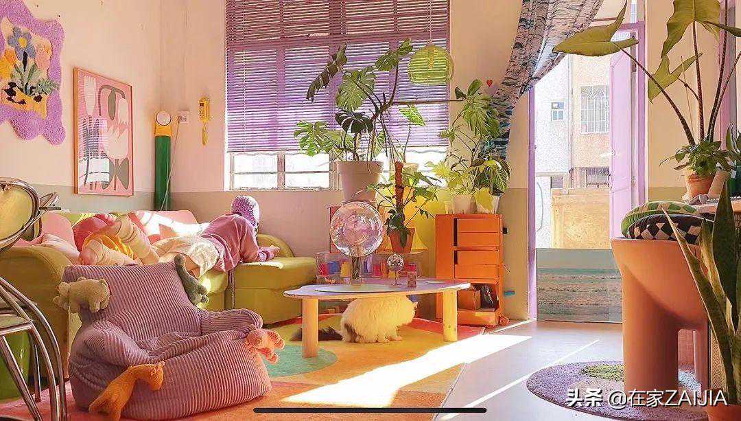 还记得你刚毕业租房住的那几年吗?你愿意花光不多的积蓄装修改造出租房吗? 很多人租房的要求都是整洁、舒适就好,并不会花费太多时间和金钱去改造出租房,总觉得是在替房东装修,不如攒下钱未来买房。 不过就像硬币的两面,还有一些人租房时最期待的就是动手改造成自己喜欢的样子~ 今天宅sir要分享的家,是一位95后女孩在广州花2000元租下的三室一厅。一个总租不出去的“老破旧”,被EVA改造成色彩缤纷的极繁小家,美到登上了家居杂志! 室内面积:80㎡+ 户型:三室一厅 改造花费:1W+ 房屋坐标:广东广州 认识TA 在家屋主:EVA 徒手改造“老破旧” 用色彩化腐朽为神奇 这个房子是三室一厅的格局,大概80㎡多,位于广州市区的一个老小区,离地铁也很近。EVA是广东河源人,客家人,这套出租房是她和男友还有三只小猫一起住。 屋主手绘户型图 房子刚租下的样子 EVA和男友把房屋打扫干净,花光当时的积蓄用一个月时间进行了整体改造。 他们也考量了改造出租房的风险,但想想大部分花费都是在软装上面,无论以后搬去哪里这些东西都是可以带走的。加上租金比精装修的出租房要便宜不少,相对来说还是划算许多。 ,时长01:14 ▲改造前后大变样 两人首先就是对家里的墙面和门进行改色,再从闲鱼淘来一些二手家具,用色彩和软装让这套“老破旧”焕然一新。 两人都是普通的月光族,预算有限,为了省钱,所有东西都是自己动手改造。 EVA网购了乳胶漆,和男友两个人亲自动手刷墙,虽然墙面刷得并不均匀,但效果还是很惊艳! 接着就是亲自贴木地板、买来二手家具DIY……初期改造下来,大概花费了一万多。 五彩斑斓的快乐小窝 淘二手家具变废为宝 EVA是个富有想象力的鬼马少女,她家的色彩既明亮又跳脱,色彩斑斓和极繁主义是她家给人的第一印象。 她把客厅墙面先刷了一遍白色乳胶漆,再用豆绿色刷了一圈墙裙,木门则被刷上了芋泥紫,百叶帘也选了同款紫色,倒是和今年的潘通流行色有些不谋而合。 家里的很多大件家具都是EVA从二手市场低价买的,甚至是她捡回家的“破烂”,经过她的改造,每一件都让人忍不住问链接! 比如客厅的绿色沙发,你敢信是她花80块钱买回家的吗? 还有这个透明茶几,其实是她捡回家的透明亚克力收纳盒,三层叠放每一层都可以打开。EVA于是花20元买了一盒塑料高脚杯,一格格放进收纳盒,立刻变身独一无二的个性茶几。 看腻了就简单换个三原色塑料杯,当茶几不方便席地而坐吃饭,就挪到一旁成为放盆栽的置物架。 绿餐桌:小铁锤家具|绿色收纳柜:Roooom|圆形地毯:odd古古绿|橘色凳子:odd古古绿 沙发旁边就是小餐厅,绿色餐椅同样是二手淘来的。白色墙面觉得单调,EVA用9个纸巾盒做装饰,活泼可爱还有些复古韵味。 粉色象腿椅:简摩|绿色镜子:DramaDeco 沙发对面的工作台也非常吸睛,这张马赛克瓷砖桌子是EVA和男友亲手DIY的。它原本只是一张普通的白色旧桌子,EVA用玻玛胶贴上瓷砖片,秒变ins风少女书桌。 入住之后,爱折腾的EVA每过一段时间都会通过加入或替换一些单品,让家换个模样,比如她特别爱买的挂画和地毯。 虽然家里有三只毛孩子掉毛,但EVA不会因为猫就放弃买各种抱枕和地毯,装饰家也是她最喜欢的事情,所以情愿在清洁方面多点费力。 ▲沙发角落里的绿色落地灯是用水管改造的;蘑菇地毯蘑菇抱枕来自EVA的店铺:MUGUHOME 有时候她家是“绝绝紫”,有时是“温柔粉”,有时又是“薄荷绿”,还有时化身“橘子海”…… EVA最喜欢呆的地方就是客厅,客厅空间大,下午的时候阳光也很好,她喜欢躺在沙发上陪猫猫一起玩耍~ 随季节变换色彩的卧室 每天都有不一样的浪漫 卧室是家里最温柔浪漫的地方,12㎡小卧室随着四季更替也在不停变换色彩。 四件套、地毯和装饰画决定了房间的氛围,春天的卧室是充满生机的粉色系。直接把床垫放地上,省下了买床的钱,时而换个位置睡起来更有新鲜感。 夏天的卧室是清新的绿色,把绿植也搬进来,用绿意给房间降温。 橘黄色置物架:希山实验室|梳妆台:吱咯家具 秋天的卧室是软乎乎的奶茶色,床品和地毯换成了温和的白,毛茸茸的地毯带来了秋季慵懒感。 奶黄色床头柜:集木物所|四件套:MinimalConcept|紫色小沙发:Papahug 冬天的卧室是明亮的紫,用明亮的色彩来对抗冬天的寒冷,绿色中古风的椅子也是EVA在闲鱼淘到的DPstuio折叠椅。 这个角落属于EVA家6㎡的衣帽间,虽然面积很小,一样被EVA布置得很精致。 ,时长01:05 可以看到,许多出现在客厅、卧室的单品其实原本放在衣帽间。EVA不喜欢一成不变的状态,即便只是将家具换换位置,她也总能在家里创造出不一样的装饰效果。 生活可爱只和人有关 不常做饭也要有好看的小厨房 她和男友一起给墙面刷了乳胶漆、为地面贴上瓷砖贴纸,搬进来家电和置物架,小厨房便有了烟火气。 宅sir采访中问EVA为何将家装成彩色,她很坦诚的回答—— 其实我也喜欢很多种风格,并非只喜欢彩色。只是如果想要精致的家、极简的家,对于我当下的经济实力比较难达到,考虑成本和出租房的硬装条件,利用各种色彩去搭配这个家会让它表现出各种可能。我改造的目的不是让这个家变成一个很精致的样板间,只是在能力范围内去让它变成我自己喜欢的样子…… 果然热爱生活的人并不需要太多的财富,仅仅需要一颗热气腾腾的心、一双发现美的眼睛和勇于改变的好心态。