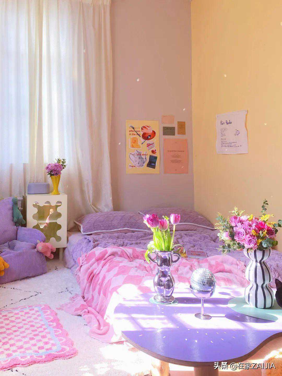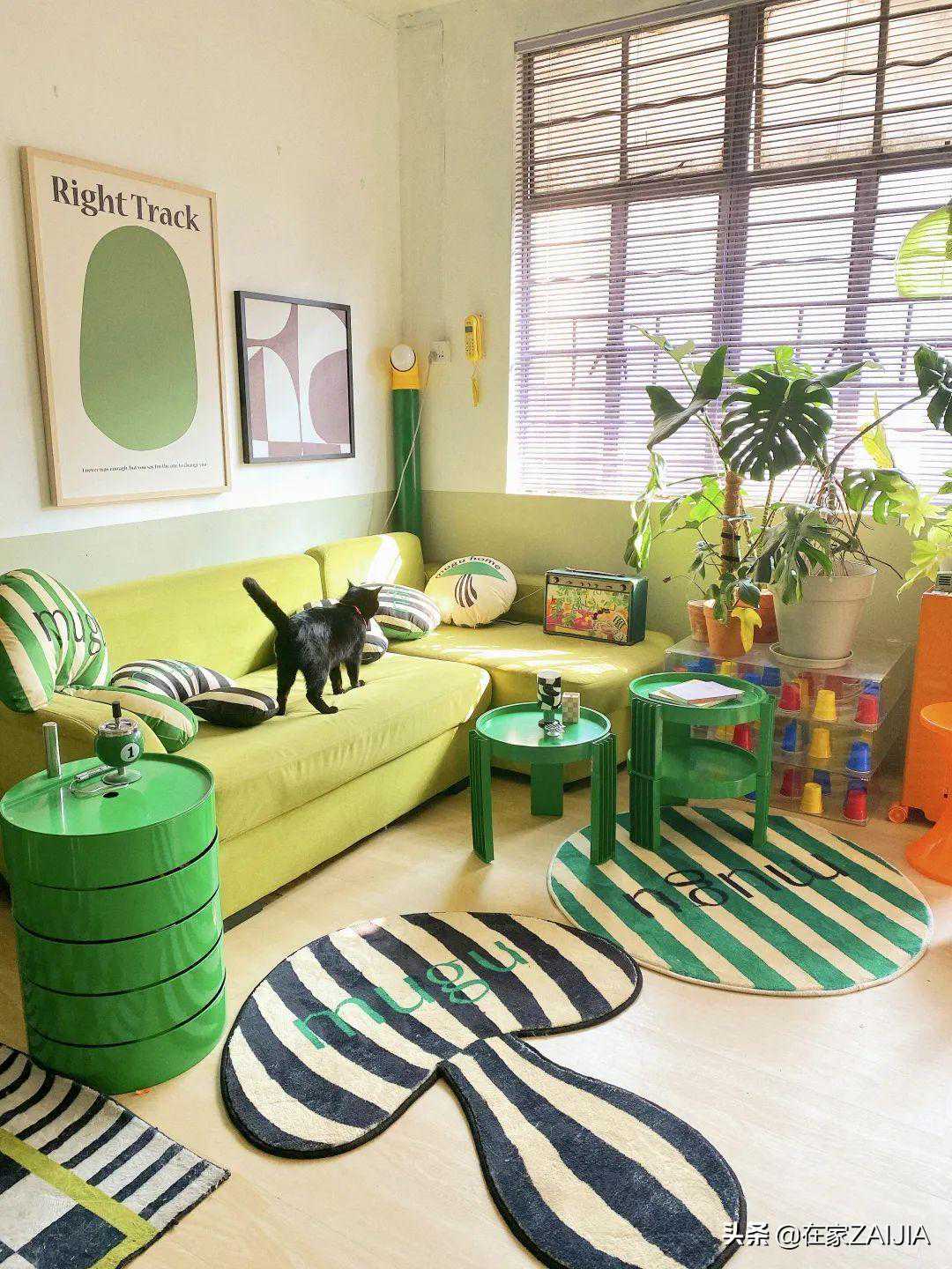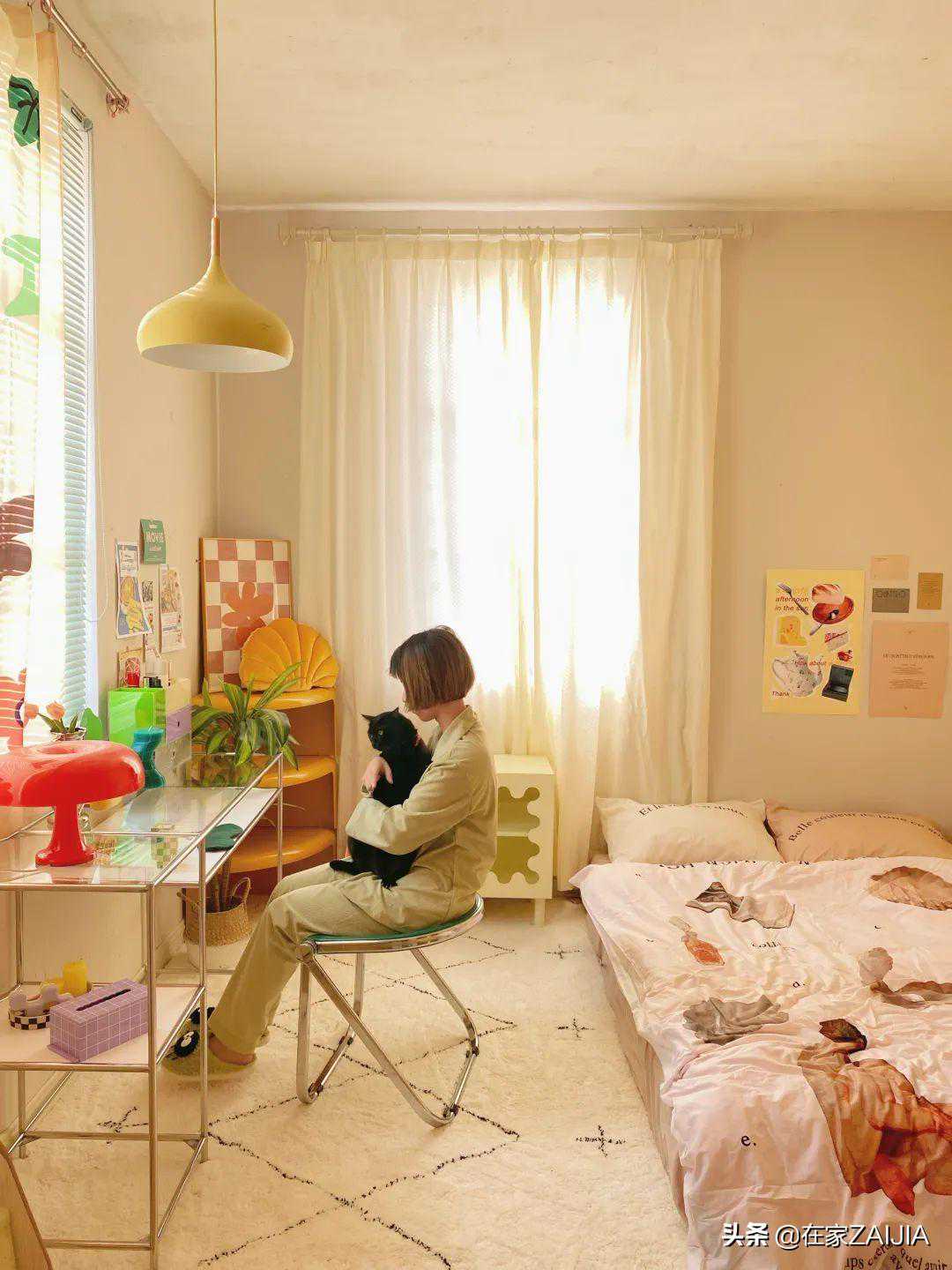 还记得你刚毕业租房住的那几年吗?你愿意花光不多的积蓄装修改造出租房吗? 很多人租房的要求都是整洁、舒适就好,并不会花费太多时间和金钱去改造出租房,总觉得是在替房东装修,不如攒下钱未来买房。 不过就像硬币的两面,还有一些人租房时最期待的就是动手改造成自己喜欢的样子~ 今天宅sir要分享的家,是一位95后女孩在广州花2000元租下的三室一厅。一个总租不出去的“老破旧”,被EVA改造成色彩缤纷的极繁小家,美到登上了家居杂志! 室内面积:80㎡+ 户型:三室一厅 改造花费:1W+ 房屋坐标:广东广州 认识TA 在家屋主:EVA 徒手改造“老破旧” 用色彩化腐朽为神奇 这个房子是三室一厅的格局,大概80㎡多,位于广州市区的一个老小区,离地铁也很近。EVA是广东河源人,客家人,这套出租房是她和男友还有三只小猫一起住。 屋主手绘户型图 房子刚租下的样子 EVA和男友把房屋打扫干净,花光当时的积蓄用一个月时间进行了整体改造。 他们也考量了改造出租房的风险,但想想大部分花费都是在软装上面,无论以后搬去哪里这些东西都是可以带走的。加上租金比精装修的出租房要便宜不少,相对来说还是划算许多。 ,时长01:14 ▲改造前后大变样 两人首先就是对家里的墙面和门进行改色,再从闲鱼淘来一些二手家具,用色彩和软装让这套“老破旧”焕然一新。 两人都是普通的月光族,预算有限,为了省钱,所有东西都是自己动手改造。 EVA网购了乳胶漆,和男友两个人亲自动手刷墙,虽然墙面刷得并不均匀,但效果还是很惊艳! 接着就是亲自贴木地板、买来二手家具DIY……初期改造下来,大概花费了一万多。 五彩斑斓的快乐小窝 淘二手家具变废为宝 EVA是个富有想象力的鬼马少女,她家的色彩既明亮又跳脱,色彩斑斓和极繁主义是她家给人的第一印象。 她把客厅墙面先刷了一遍白色乳胶漆,再用豆绿色刷了一圈墙裙,木门则被刷上了芋泥紫,百叶帘也选了同款紫色,倒是和今年的潘通流行色有些不谋而合。 家里的很多大件家具都是EVA从二手市场低价买的,甚至是她捡回家的“破烂”,经过她的改造,每一件都让人忍不住问链接! 比如客厅的绿色沙发,你敢信是她花80块钱买回家的吗? 还有这个透明茶几,其实是她捡回家的透明亚克力收纳盒,三层叠放每一层都可以打开。EVA于是花20元买了一盒塑料高脚杯,一格格放进收纳盒,立刻变身独一无二的个性茶几。 看腻了就简单换个三原色塑料杯,当茶几不方便席地而坐吃饭,就挪到一旁成为放盆栽的置物架。 绿餐桌:小铁锤家具|绿色收纳柜:Roooom|圆形地毯:odd古古绿|橘色凳子:odd古古绿 沙发旁边就是小餐厅,绿色餐椅同样是二手淘来的。白色墙面觉得单调,EVA用9个纸巾盒做装饰,活泼可爱还有些复古韵味。 粉色象腿椅:简摩|绿色镜子:DramaDeco 沙发对面的工作台也非常吸睛,这张马赛克瓷砖桌子是EVA和男友亲手DIY的。它原本只是一张普通的白色旧桌子,EVA用玻玛胶贴上瓷砖片,秒变ins风少女书桌。 入住之后,爱折腾的EVA每过一段时间都会通过加入或替换一些单品,让家换个模样,比如她特别爱买的挂画和地毯。 虽然家里有三只毛孩子掉毛,但EVA不会因为猫就放弃买各种抱枕和地毯,装饰家也是她最喜欢的事情,所以情愿在清洁方面多点费力。 ▲沙发角落里的绿色落地灯是用水管改造的;蘑菇地毯蘑菇抱枕来自EVA的店铺:MUGUHOME 有时候她家是“绝绝紫”,有时是“温柔粉”,有时又是“薄荷绿”,还有时化身“橘子海”…… EVA最喜欢呆的地方就是客厅,客厅空间大,下午的时候阳光也很好,她喜欢躺在沙发上陪猫猫一起玩耍~ 随季节变换色彩的卧室 每天都有不一样的浪漫 卧室是家里最温柔浪漫的地方,12㎡小卧室随着四季更替也在不停变换色彩。 四件套、地毯和装饰画决定了房间的氛围,春天的卧室是充满生机的粉色系。直接把床垫放地上,省下了买床的钱,时而换个位置睡起来更有新鲜感。 夏天的卧室是清新的绿色,把绿植也搬进来,用绿意给房间降温。 橘黄色置物架:希山实验室|梳妆台:吱咯家具 秋天的卧室是软乎乎的奶茶色,床品和地毯换成了温和的白,毛茸茸的地毯带来了秋季慵懒感。 奶黄色床头柜:集木物所|四件套:MinimalConcept|紫色小沙发:Papahug 冬天的卧室是明亮的紫,用明亮的色彩来对抗冬天的寒冷,绿色中古风的椅子也是EVA在闲鱼淘到的DPstuio折叠椅。 这个角落属于EVA家6㎡的衣帽间,虽然面积很小,一样被EVA布置得很精致。 ,时长01:05 可以看到,许多出现在客厅、卧室的单品其实原本放在衣帽间。EVA不喜欢一成不变的状态,即便只是将家具换换位置,她也总能在家里创造出不一样的装饰效果。 生活可爱只和人有关 不常做饭也要有好看的小厨房 她和男友一起给墙面刷了乳胶漆、为地面贴上瓷砖贴纸,搬进来家电和置物架,小厨房便有了烟火气。 宅sir采访中问EVA为何将家装成彩色,她很坦诚的回答—— 其实我也喜欢很多种风格,并非只喜欢彩色。只是如果想要精致的家、极简的家,对于我当下的经济实力比较难达到,考虑成本和出租房的硬装条件,利用各种色彩去搭配这个家会让它表现出各种可能。我改造的目的不是让这个家变成一个很精致的样板间,只是在能力范围内去让它变成我自己喜欢的样子…… 果然热爱生活的人并不需要太多的财富,仅仅需要一颗热气腾腾的心、一双发现美的眼睛和勇于改变的好心态。