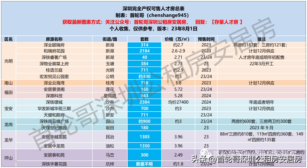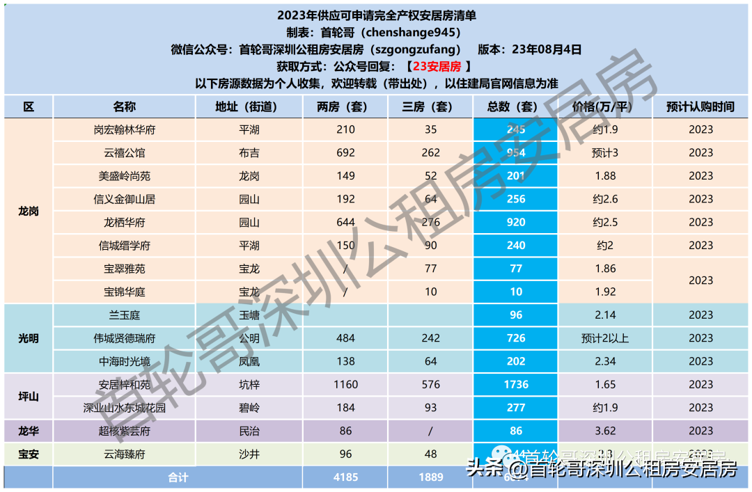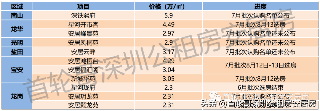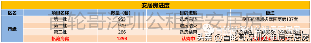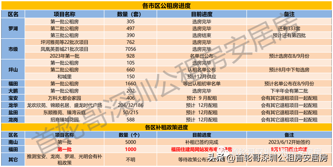 01 公租房 截止到今天(8月12日),能申请的只有福田区面向公租房轮候库家庭的补租,申请截止日期到8月17日,申请补租需要的条件及补租金额请看下面公众号文章: 官宣!超9万元,福田公租房家庭租房补租即将开始申请 截止到今天(8月12日),所有公租房都没有可以申请的; 4月1日至6月30日申请加入公租房轮候库的家庭,还在入库审核阶段,预计在10月左右公布入库名单; 4月1日及之前申请入库的家庭都已经正式加入公租房轮候库,官网查询排名地址如下: 安居房 2023年已经配售过4批安居房,截止到今天(8月12日)还能认购的项目只有帆湾海寓,这两年最便宜的安居房,请没认购的家庭抓紧认购: 最低首付30万买完全产权的安居房,认购只剩最后4天 今年还有超6000套安居房供应,清单如下: 1月1日至3月31日申请加入安居房轮候库的家庭,还在入库审核阶段,预计在8/9月左右公布入库名单(本来按进度7月份应该公布,估计应该受到新政影响推迟公布名单了); 可售人才房 6/7批次各个可售人才房目前的进度,星河开市客、鸿栖台、福汇阁、新城华苑这四个可售人才房都在今明两天选房; 今明两年会供应的可售人才房清单: