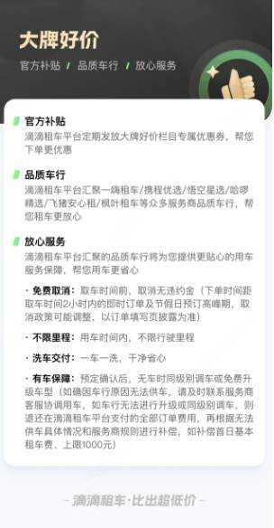 目前,滴滴租车平台已接入携程租车、哈啰租车、悟空租车、飞猪租车等行业伙伴商家,连接超1万家车行,在成都、北京、西安、广州等全国300多城市运营。 郊区放空、野外露营、周边参加音乐节等等,都是年轻人选择租车的常见场景。根据平台数据显示,滴滴租车试运营以来,租车订单中本地游场景订单占比最高,超过35%,周末这一比例超过40%。 端午假期将至,周期短、距离长、路线灵活的自驾出行需求将持续上涨,滴滴租车将通过多方比价和滴滴限时6折优惠的形式,联合众多租车合作伙伴,为用户提供更优惠的租车好服务。 同时,滴滴租车还推出“大牌好价”栏目,由平台筛选出评价好、服务优的品质车行,为用户提供优质好价的租车服务。从“大牌好价”租用的车辆,平台承诺“放心服务”,包括免费取消、不限里程、洗车交付、有车保障等。 滴滴租车“大牌好价”栏目为用户提供多项服务保障 此外,滴滴租车还通过持续优化免押能力、推动全流程信息展示标准化、突出展示用户实付总价等方式,努力降低租车服务使用门槛,提升租车服务信息透明度,让用户租车更方便、更安心。 推广 【如果您有新闻线索,欢迎向我们报料,一经采纳有费用酬谢。报料,报料QQ:3386405712】
