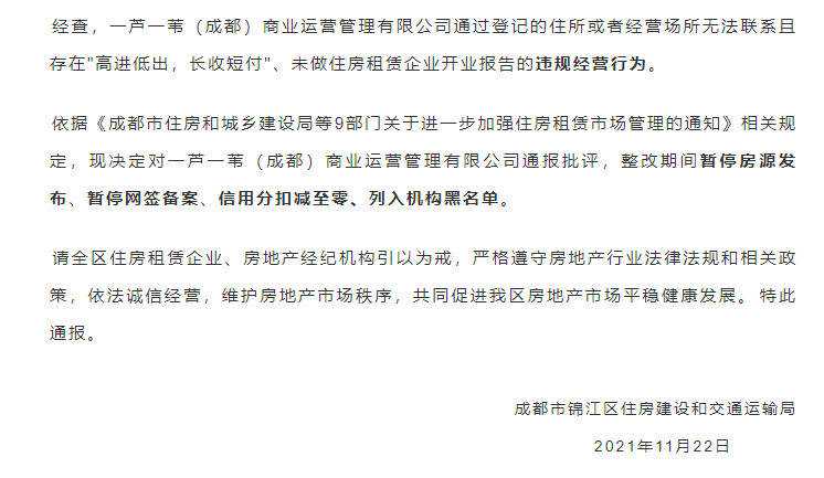 封面新闻记者苟春 一次性向包租公司付清了一年的房租,没想到房东在一个月后找上门说自己并未收到房租。徐先生不免疑惑,自己租房时不是已经交齐了一年的房租吗? 10月21日,徐先生因为工作原因需要租房,在某平台联系到了一位“个人房东”。接触之后,徐先生发现该“个人房东”实为某公司的租房销售。10月22日,徐先生与其签约,并支付了16200元的年付租金。 一个月后,房东却找上了门,告诉徐先生自己并未收到租金。两人联系该销售得到了并不知情的回复。之后,他们到该公司经营许可地查看,发现该公司注册地址目前实际经营着一家饮品店,且具有同一地址的营业执照。 租客与中介的聊天记录 租房 租客付清房费房东未收到租金 徐先生因为工作原因需要租房,10月21日,他在某平台联系到一位自称名为谭宇的个人房东。接触之后,徐先生发现谭宇实为“一芦一苇(成都)商业运营管理有限公司”的租房销售。谭宇带他去了成都市青羊区顺城大街的公寓看房,提供了该公司的营业执照、租客合同等材料,并称公司已获得本市住房租赁资质。 徐先生告诉记者,自己了解到,成都凡是从事住房租赁业务的住房租赁企业,在开展、退出住房租赁业务前或发生开业相关重要信息变更后须向工商注册所在地住建部门报送开业信息。但徐先生发现该公司并未报备。 直到11月20日,房东敲开了徐先生的门,并告知自己并没有收到房租,徐先生这才意识到可能被骗了。两人再次联系谭宇,却得到了其并不知情的回复。 记者了解到,这并不是个例。11月23日,李女士在刷微博时发现同城博主发布了的消息。对比中介信息及付款码图片后,李女士发现自己也在同一家公司租的房,这才意识到被骗了。之后,她联系到与其签合同的销售谭宇凡(经过两位租客证实与上文谭宇为一人),未得到回复。 一芦一苇(成都)商业运营管理有限公司的注册地址实际经营着一家饮品店。 调查 注册地实际为饮品店 “我之前把公寓出租的信息挂到了网上,谭宇就联系我提出帮忙转租。”11月29日,封面新闻记者联系到徐先生的房东赖女士。赖女士告诉记者,10月14日,她和谭宇签了转租的业主授权委托书。“当时我也提出了要去公司签合同,他就以公司还在装修为由拒绝了这个请求。”赖女士说。 “我之前是把房子租给了酒店的。”赖女士说,与酒店工作人员闲聊之后发现徐先生以1350元每月的价格租到了房子,但自己租给谭宇是签订的每月2300元的合同。赖女士告诉记者,对方还在支付租金时找各种理由推三阻四,这就让她更觉得不对劲了。 房东与中介的聊天记录 11月20日,赖女士敲开出租公寓的门,与徐先生见了面。两人越发觉得不对劲,就去了该公司注册地址,却发现该公司注册地实际经营着一家饮品店。 11月29日,封面新闻记者拨打了徐先生等提供的谭宇电话,均未拨通。记者到该公司注册地址走访调查,发现该地址确为一家饮品店。而这家饮品店营业执照中的营业地址与该公司注册地址一致。该店一工作人员表示,自己并不知情。 锦江区住房建设和交通运输局发布风险提示 通报 高进低出长收短付已列入黑名单 记者搜索发现,11月22日,成都市锦江区住房建设和交通运输局发布了“关于一芦一苇(成都)商业运营管理有限公司经营风险的提示”。 据@成都微博房产发布信息,11月22日,成都市锦江区住房建设和交通运输局依据《成都市住房和城乡建设局等9部门关于进一步加强住房租赁市场管理的通知》相关规定,决定对一芦一苇(成都)商业运营管理有限公司通报批评,整改期间暂停房源发布、暂停网签备案、信用分扣减至零、列入机构黑名单。 徐先生告诉记者,11月28日,因受害者较多,该案已经被公安机关受理,目前正在进一步调查当中。 一芦一苇(成都)商业运营管理有限公司被暂停房源发布、暂停网签备案、信用分扣减至零、列入机构黑名单。 律师 收取租金后逃匿涉嫌诈骗 徐先生提出质疑,该公司上述行为是否构成诈骗?对此,封面新闻记者采访了中国政策科学研究会特邀研究员、太琨律创始合伙人朱界平律师。 他告诉记者,根据我国《刑法》第二百二十四条的规定合同诈骗罪是指以非法占有为目的,在签订、履行合同过程中,骗取对方当事人财物的,如没有实际履行能力,以先履行小额合同或者部分履行合同的方法,诱骗对方当事人继续签订和履行合同的;收受对方当事人给付的货物、货款、预付款或者担保财产后逃匿的均构成合同诈骗罪。“包租公司通过高收低租的经营方式与被害人签订合同,如果公司从一开始就不具有履行合同的能力或者在收取租金后逃匿则涉嫌构成此罪。” 朱界平提醒,需要租房或者要将房屋给包租公司打理的市民要多了解该公司的经营能力,避免此类情况发生。如果发生上述情况应第一时间报案,尽量挽回损失。 【如果您有新闻线索,欢迎向我们报料,一经采纳有费用酬谢。报料,报料QQ:3386405712】