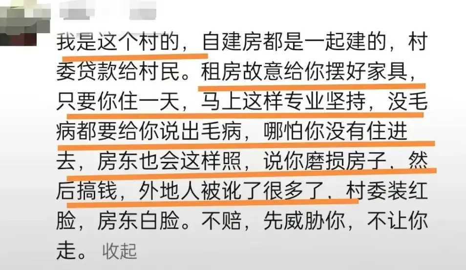 据报道,这位女子在退租过程中,房东竟然拿着探灯对房屋内的每一个角落、每一件物品进行仔细检查,甚至连厕所的蹲坑都不放过。最终,房东竟然提出了超过1万元的赔偿要求,让人不禁捏了一把冷汗。 面对网友的质疑,当地村委出面回应,称这是租客的问题,并表示已进行三方调解。然而,这一回应并未平息争议,反而激起了更多的疑问。 网友们纷纷表示怀疑,质疑村委是否在背后包庇黑心房东,甚至怀疑整个村庄是否都沦为了这种利益链的受益者。 更令人震惊的是,有网友爆料称,当地村庄的房屋统一由村委提供贷款建造,而这背后竟然暗藏着一个联手敲诈租客的利益链。村委在背后撑腰,最终将赃款分配给各方,令人不胜唏嘘。 面对舆论的强烈呼声,多部门已经介入调查此事。他们表示将会全面调查,查清事实真相,惩治涉案人员,还受害租客一个公道。 同时,有关部门也呼吁广大租客和房东要加强自我保护意识,及时举报类似敲诈勒索行为,共同维护良好的租赁市场秩序。 如果你有类似的经历或者看法,请留言分享,让我们共同为维护公平正义的租赁市场贡献力量。记得点赞并分享这篇文章,让更多人看到!