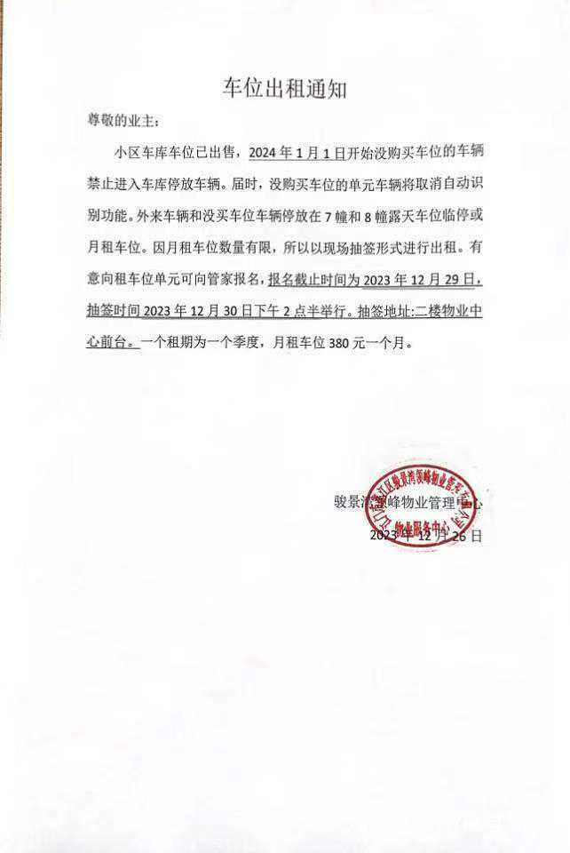 “小区地下车位只售不租,没有购买车位的业主不能进入地下车库。”近日,南都记者收到江门市蓬江区骏景湾领峰业主报料称,小区地下车位刚开售不久,物业就发布地下停车场车位“只售不租”通知,给业主出行造成很大不便,而地下车库几百个车位空着,也不让业主租赁或临停,意图就是为了卖车位,业主认为开发商此举很不合理。那么,具体情况如何?南都记者就此展开调查。 未购买车位的业主不可进入地下车库停放 “去年12月,物业公司发布了一份小区露天车位出租通知强调,小区车库车位已出售,2024年1月1日开始没购买车位的车辆禁止进入车库停放车辆。届时,没购买车位的单元车辆将取消自动识别功能。”骏景湾领峰业主杨女士告诉南都记者,小区地下车位去年11月才开盘,12月就通知业主不购买地下车位的业主不可进入地下车库,未出售的车位既不对业主出租,业主也不可临停,此举很不合理。 “自2023年11月26日开始出售地下车库车位,标准车位(普通)18万元,折后16.2万元,而标准车位(普通)充电桩售价是19万元,打完折超过17万元,这个价格比较高,很多业主都未购买车位。”骏景湾领峰业主余小姐说,现在开发商强制要求业主不买车位就不能停地下车库,只能将车停放在地面停车位,这样给业主造成很大不便。 杨女士和余小姐说,不少业主提出的诉求是要求开发商允许未购买车位的业主可以进入地下车库,免费临停3小时,超过3小时合理收费;未出售的车位以合理价格对业主出租。为业主搬运货物的外来车辆经登记确认后可以进入地下车库,免费临停3小时,超过3小时合理收费(未出售车位租金标准应参照周边多数小区;超时收费标准建议参照万达、汇悦城等周边大型停车场,并经业主同意)。 露天停车收租不合理?业主认为不应该收费 除了地下车位只售不租,杨女士还表示,小区露天车位收费也不合理。“2024年3月1日开始,物业管理公司将地面车位以每月收取380元租金的方式对业主进行出租,且每次预收一个季度的租金。没有租地面车位的业主如果临时将车停到地面车位,超过1小时按每小时5元收费,24小时收费20元,每月按30天计算临时停车费高达600元。”杨女士向南都记者表示,“根据民法典第二百七十五条规定,占用业主共有的道路或者其他场地用于停放汽车的车位,属于业主共有。” 对此,杨女士说,小区业主提出的诉求是小区地面停车位属全体业主共有,应停止收费,建议以先到先停原则免费给业主使用。业主来访的亲戚朋友车辆经登记确认后免费停放在小区地面停车位。 “小区入住率不高,之前我停车都停在附近的路边,最近社区也发通知提醒,路边停车可能会被交警部门处罚。”余小姐说,这不就是要我们都停到小区里面的收费车位吗? 走访调查:地下停车位空置率高 骏景湾领峰位于蓬江区滨江新区园山湖公园旁,开发商为江门市蓬江区骏景湾领峰房地产有限公司,整个小区共有800多户,南都记者现场走访发现,由于小区入住率不高,日常很多地下停车位空置,没有停放车辆。 南都记者通过江门市住建局官网查询该楼盘地下停车场产权小车位备案价,以DX072车位为例,套内面积13.25m²,建筑面积29.08m²,申报单价6189.82元/m²,申报总价180000元;该小区的DX042车位套内面积13.25平方米,建筑面积29.08m²,申报单价6533.70元/m²,申报总价190000元。根据业主提供的车位价格显示,人防标准车位的租赁价是140000元,开发商在前期给出的优惠价是126000元(开盘10天内付清专享9折优惠),因此,不少业主表示,虽然人防车位是可以租赁,但是租赁价格并不便宜,相当于购买价格。 南都记者在走访中也发现,骏景湾领峰露天停车位停的车辆也不多,但是在小区外面的周边道路停有不少车辆,在落款为华盛社区居民委员会的《关于华盛社区辖区道路开启违停抄牌的公告》中写道“为进一步加强华盛社区辖区道路交通管理工作,提升道路停车秩序综合治理水平,深化疏堵保畅工作,蓬江区棠下镇交警中队根据我辖区交通实际,针对违停现象进行整治,此前已对部分路段进行违停罚款,预计下周开始将会加大执法力度。” 物业公司:“只售不租”方案目前没有调整,业主有需求可开车进入 针对业主反映的情况,骏景湾领峰物业管理中心负责人向南都记者表示,小区总共有800多户,地下停车位有600多个,已经出售100多个,地上车位有100多个;小区地下产权车位只售不租是开发商那边的方案,物业公司只是负责管理,业主提出租赁和临停的诉求,也给公司上面反映过,目前得到的回复是方案没有调整。这位负责人也表示,没有购买车位的业主如果有需要,跟保安报备之后也可以开车去地下车库,比如下雨天接送老人、小孩,装修材料、外出买一些大件的东西回家等,并不是说没有购买车位就不能开车进入,只是进入之后不能长时间停在地下车库。 骏景湾领峰物业管理中心负责人表示,目前小区常住业主只有一百多户,已经拿出部分露天车位放租,业主可以租露天停车位停车,至于业主提到的露天停车位不应该收费的问题。该负责人表示,这些露天停车位是楼盘设计时就规划好的,并不是后面临时改变小区道路或绿化带等,所以对车位收费是合理的。 只售不租的行为是否合理合法?江门市蓬江区住房和城乡建设局这样回应 那么,开发商对地下车位只售不租的行为是否合理合法?对此,南都记者采访了江门市蓬江区住房和城乡