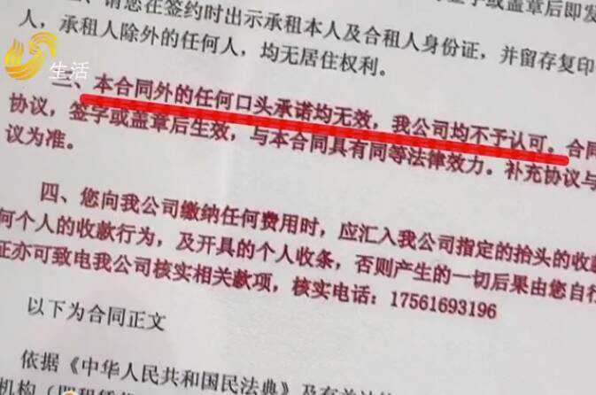 齐鲁网·闪电新闻8月16家住潍坊的刘女士想趁假期去青岛玩两个月,于是在网上找了一个中介,租了一间房,可没想到还没住满两个月,房门却进不去了。 “第一个月交了4316元,包括房屋租金1600元,月付手续费80元,物业费6元,管理费730元,水电费用300元,房屋押金1600元,然后第二个月我交了1686元,但是他又多问我要了一些钱,一共是1700多元。”刘女士告诉记者。 7月8日,按照对方的要求,刘女士给其提供的公司账号转了第二个月的房租,本以为可以安安稳稳的住满两个月,8月23日办理退房手续,可没想到,8月8日中介便通知她需要续租了。 刘女士告诉记者:“从8月8日开始,就受到中介恐吓,说要把外面门锁换了密码,东西也别想拿走,但是我的房费已经交到了8月23日。” 在刘女士提供的租房合同中记者看到:房屋租赁期自2023年6月23日至2024年6月22日,共计1年,按照合同约定,8月8日是最晚续租付款日。刘女士说,虽然合同是这么规定的,但对方也曾给予过她口头承诺。 “中介骗我说没有两个月的短期合同,青岛只有一年的租赁合同,之前承诺我,两个月到期后退还水电押金房屋押金管理费。”刘女士告诉记者。 记者在两人的聊天记录中也确实看到了:“一个月押金,到期正常退”,以及“两个月过渡住,环境好”等内容。通过聊天记录来看,对方是知道刘女士只租两个月的情况。 为了进一步了解情况,记者通过微信联系了租房经办人,表示当初对方说住两个月没问题,为什么签一年的合同?但记者话还没说完,对方便直接挂断了。刘女士说,8月23日房租才到期,但现在门锁的密码已经换了,行李也没法拿了。 中介公司:合同内容明确口头承诺不作数 当初双方到底是如何约定的?刘女士为何又跟对方签订一年长租合同呢?为了弄清楚情况,记者再次与当时租房经办人取得联系。 “合同上写的也不是两个月的合同,字是刘女士自己签的,现在要么交房租,要么搬走。”当记者提出见面协商时,租房经办人表示他已经离职,不再负责刘女士的事情。 经过多方沟通,记者得到了合同中租赁代理机构青岛极客公寓管理有限公司的办公地点。针对刘女士遇到的问题,工作人员也给予了回复。 青岛极客公寓管理有限公司工作人员告诉记者,在租房旺季,他们公司会临时聘请一些销售来帮忙,对接刘女士的便是临时销售,而为了避免此类纠纷,合同里也明确了:“合同外的任何口头承诺均无效,我公司均不予认可”。至于换门锁密码,则是因为刘女士没有履行合同支付房租。 “月付我们是提前15天交房租的,其实她这个房租按正常走的话就是到8号,因为在签合同的时候,我们每一条都写的非常清楚,什么时候交房租,甚至说一年到结束,咱都是写得非常清楚的。”工作人员表示。 如若不续租,工作人员说,刘女士不仅无法继续居住到23日,按照合同约定,还将支付两个月的违约金,经过记者协调,考虑到刘女士的实际情况,青岛极客公寓管理有限公司方也给出了解决方案。 “本身是8日到期,现在让她住到23日,我们也不收取任何费用,基本上是免了15天的一个房租,还有就是在这23号之间,我们会全力以赴帮她转租出去,来减少她的损失,这算是做出最大的一个让步了。”工作人员表示。