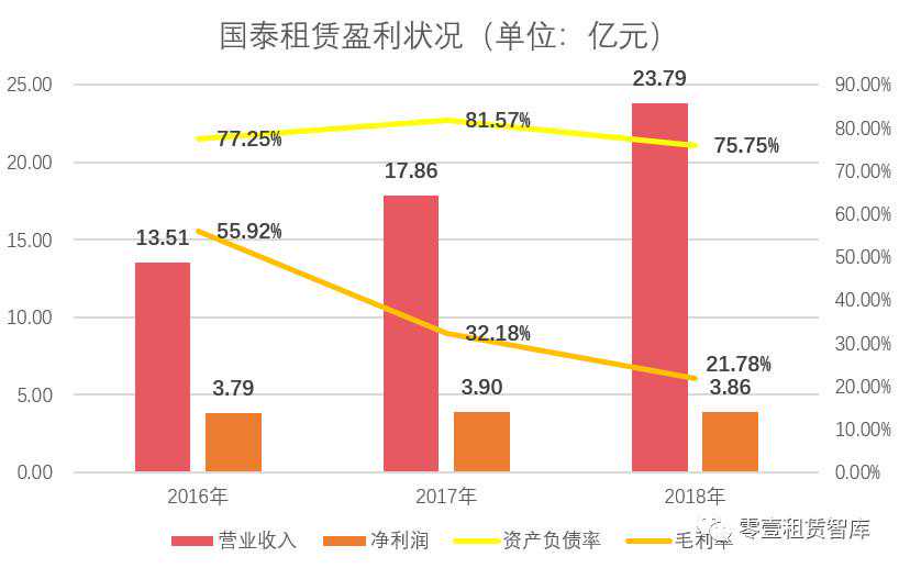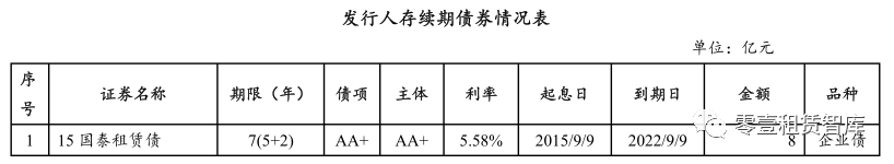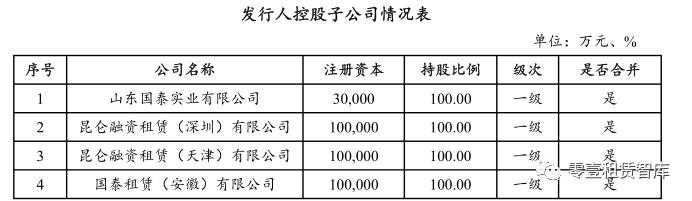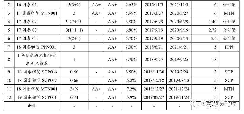 国泰租赁有限公司(简称“国泰租赁”)成立于2007年2月,注册资本30亿元,业务立足山东,以基础设施、水利环境管理和商业物业为核心,近几年,国泰租赁主营业务收入稳步提高,经营状况良好。截至2018年9月末,应收租赁款不良率为1.37%,2019年营运资金和偿债资金需求数量较大,目前尚存73亿未偿债券。 01|公司概况 国泰租赁成立于2007年2月,目前股东为山东省国资委和山东国惠投资有限公司,其中山东国惠投资为控股股东,山东省国资委为实际控制人,股东背景强大,为公司业务的快速发展提供了强有力的保障。目前注册资本为30亿元。 截至2018年末,国泰租赁纳入合并报表范围的一级子公司有4家,为全资控股子公司山东国泰实业有限公司、昆仑融资租赁(深圳)有限公司、昆仑融资租赁(天津)有限公司和国泰租赁(安徽)有限公司。 02|业务立足山东,以基础设施、水利环境管理和商业物业为核心 业务行业方面,国泰租赁走以产业为基础的专业化路线,以基础设施、水利环境管理和商业物业为核心,兼顾节能环保设备、运载设备业务,适时介入飞机、船舶等大型标的物业务和收益率较高的其他租赁业务。 业务地域方面,国泰租赁立足山东,面向全国,形成以长三角、珠三角、环渤海区域为重点区域,东北、西北、西南区域为次重点区域的全国业务布局,以香港为基点,探索全球业务拓展。 目前,国泰租赁主要以融资租赁和经营租赁两种模式开展业务。融资租赁业务是国泰租赁的主营业务,主要以售后回租为主,2015-2018年,融资租赁业务收入均占到营业收入的80%以上。 03|收入稳步提高,不良应收租赁款集中于机械制造板块 2016-2018年,国泰租赁主营业务收入稳步提高,经营状况良好。 截至2018年末,国泰租赁总资产达266.03亿元,较上年末增长6.90%,资产负债率为75.75%,较上年末下降了5.82个百分点。2018年实现营业收入23.79亿元,较上年增长33.29%,增长幅度较大,实现净利润3.86亿元,较上年略降1.03%。营业毛利率逐年下降,这是由于2016年度国泰租赁新增借款尚未到付息日,且资金成本较低,导致毛利率较高。 近几年,国泰租赁不良应收租赁款余额逐年下降,截至2018年9月末,不良租赁余额为2.48亿元,应收租赁款不良率为1.37%。逾期融资租赁款的行业分布较为分散,主要分布于机械制造、化工及轻工业、交通运输、仓储和邮政业等受国家宏观经济政策影响较大的行业,目前逾期融资租赁客户集中于山东省区域内。截至2018年9月末,机械制造板块不良率最高,达到24.68%,化工及轻工业板块不良率为次高达7.34%。 04|融资情况:偿债资金需求大,目前尚存73亿未偿债券 国泰租赁2019年营运资金和偿债资金需求数量较大。 截至2018年末,国泰租赁2018年需要偿付的各类债券余额约为63.52亿元。业务规模的迅速扩张使得其2019年营运资金的需求量较大。虽然债务金额较大,但其业务增长速度保持在较高水平,未来的租金回流及利息收入能够有力的支撑公司的偿债能力。国泰租赁的现金流情况一直保持稳定,充足的现金流量也可以保障公司及时支付债券本息。 截至2019年一季度末,国泰租赁尚在存续期的债券共12只,合计73.52亿元。具体情况如下:
