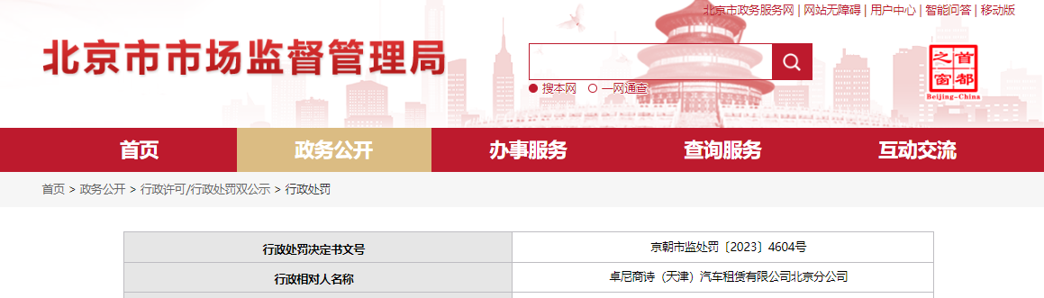 中6月29日,北京市朝阳区市场监管局对卓尼商诗(天津)汽车租赁有限公司北京分公司作出行政处罚。行政处罚决定书文号:京朝市监处罚〔2023〕4604号。
