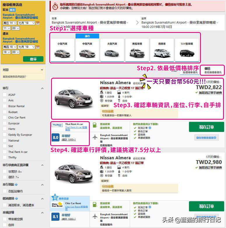泰国租车推荐&重点攻略来啰。来泰国自驾最好奇的:泰国租车费用、所需驾照、泰国租车保险,hertz、avis等评价,所有注意事项都整理在这啦。泰国租车自驾上,曼谷租车、清迈租车、清莱、华欣、普吉岛都很热门。 原因很简单近郊交通相对不便,包车又太贵,来泰国租车弹性又尽兴。不过特别留意泰国右驾(和国内相反), 上路时记得更加小心驾驶喔。话不多说赶紧来看看如何找出便宜、评价好的租车公司,轻松展开泰国自驾游吧! ▌泰国租车推荐:全球最大租车比价网,中文介面、保险理赔无上限 泰国租车推荐的是Rentalcars(全球最大租车比价网),秒速比价泰国知名租车公司(hertz、avis、budge等), 且在曼谷廊曼机场、素万那普机场、清迈机场、清莱机场、华欣、苏美岛、普吉岛等热门地区通通有据点。 画面全中文、最低价格保证(比直接和车行租便宜),还有中文客服电话(02-7741-7993)解惑,太方便了!!! 更棒的是保险理赔无上限,蓝猫及好友曾各自在冰岛、澳洲获得6642元、26569元赔偿金额,从此无敌推荐。 ►泰国租车比价找便宜: ▌泰国租车步骤:选择租还车地点(可不同地点还车) 因为中文介面,所以租用的过程相当简单,第一页输入取、还车的地点和日期即可。 有需要「甲地租车」「乙地还车」,勾选「于不同地点还车」就好啰,是不是超容易。 ▌泰国租车费用:便宜&评价好兼备是王道(以曼谷为例) 接下来进入选择车种、车行、价格等选择,长途旅行大家最担心的行李空间,上面有显示喔, 可依据预算和喜好做决定。用「最低价格排序」会发现,最便宜费用换算下来一天只要123元耶!!! ★建议提醒:车行评分最好7.5分以上,过低通常事后还车问题不断。 以曼谷机场租车来说国际品牌hertz,以及泰国本地公司ThaiRentaCar、BizcarRental分数都很高, 但avis分数就不行,因地点而异。清迈租车、华欣、普吉岛、苏芭达雅等地分数又不一样,记得逐一查看喔~ ►泰国租车省钱比价去: ▌曼谷租车自驾重点:租车年龄、自负额、押金 再进入下一页,这里重点更多了,别急着按「继续订车」,画面右上角「重要讯息」一定要点开。 大家最在意自赔额(发生车祸、偷车时你最高可能要赔的钱)、押金、租车年龄、主驾驶人信用卡支付都在这。 ★每家车行要求都不一样,千万要看清楚喔!!! ▌泰国租车保险:全保障制度,理赔等于无上限 同一页还有个无敌重要的地方,那就是泰国租车保险。「完全保障制度」等于全险概念, 蓝猫强烈推荐大家绝对绝对绝对要买!!!一天只要103元左右(每家不同),价格不贵,但保障范围非常非常多~ 免费送的碰撞险和窃盗险是不够的(有自付额,出事你还是得赔)。但买了「完全保障制度」, 车窗、后照降、方向盘、轮胎、挡风玻璃、遗失钥匙、反锁车辆都是0自付额,理赔等于无上限。 蓝猫这些年在Rentalcars租车10次以上了,先后历经车门断裂、车窗被砸破、弄丢车钥匙、反锁车辆 都好在因为有买Rentalcars保险,全数理赔一毛也没损失,泰国又是右驾相对不习惯,保险真的不能省啊。 ►全球最大租车比价网站: ▌泰国租车细节:48小时前全额退款、班机延误保留 最后填上主驾驶人个资,航班延误的话,租车公司会自动保留预约,不用苦恼怎么连络租车公司喔。 付款资讯则建议全额付款,取车前48小时以上取消皆可全额退款;但选择只付订金的话,取消是不会退回订金的! 泰国曼谷租车完成啰,国际hertz、budge、National;在地ThaiRentAcar、BizcarRental等, 都是便宜评价又棒的好选择呢,不敢踏出泰国自驾第一步的人,快来试试蓝猫最爱用的吧~ ▌泰国自驾租车注意事项 1.泰国租车年龄 18岁以上可以开车,但还是得以各家租车公司对「最低价驾驶年龄限制」为主,且可能会加收年轻人驾驶费用。 2.泰国租车必备文件 国内驾照、国际驾照、护照、主驾驶人信用卡(租车时那张,额度要足够支付押金),其他同车乘客信用卡不行。 3.驾驶方向 泰国右驾,和国内相反,汽车要靠左行喔,不习惯的话,献上蓝猫的口诀: 靠左线道行驶,左转拐小弯,右转拐大弯,过叉路先看右再看左,多念几次很快就熟练啰。 4.泰国交通规则 时速限制:市区限速时速50-60公里;高速公路限速时速90-120公里 听从交警指示:泰国警察对着你吹口哨时,立刻停车;吹两声时就可以离开啰 少按喇叭:泰国人认为按喇叭不礼貌,尤其是长按喇叭更是禁忌 红灯规范:红灯时汽车可以左转 绝对路权:泰国很重视路权,行人绝对优先、干道优先支道、圆环内优先圆环外,这对事故行则判定超重要喔 停车:除了曼谷市中心,大多都可以随意停车,路边画有红白条纹禁止停车 交通号志:和国内差不多,比较特别的是下面的「停止」&「让行」,其他可参考这里 5.泰国加油方式&细节 泰国加油站以人工加油为主超简单,可选择用现金or信用卡支付,不过有几点要特别留意: 加什么油:取车时记得问租车公司(柴油、汽油91、95等) 选哪加油:PTTGROUP、Caltex、Shell、ESSO等大厂就对了 油价:和国内差不多,可以放心 要小心:泰国高速公路上没有加油站,但高速出口下去一定有,提早加或撑住考虑看看吧 省钱秘诀:还车时满油还车较便宜,忘记或选车行帮你加满,通常比较贵喔 6.取车&验车魔鬼细节 陌生又语言不通情况下,取车有时租车柜台会怂恿加买保险、升级车款,有买Rentalcars附加保险,要直接拒绝喔。 验车时为了保险起见,检查完大灯、煞车、轮胎、车体外观、内装、油量后,