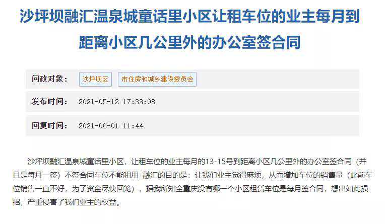 “重庆融汇投资有限公司(以下简称‘融汇公司’)每年都在销售车位,但销售效果并不理想。想通过限制签订租赁合同的方式,变相达到只售不租的目的。”近日,网友向重庆网络问政平台反映,融汇公司收回融汇温泉城未售车位出租权,设置工作日签订租赁车位协议、到指定地点签约、每月一签等门槛,限制业主租赁车位。 5月6日,融汇公司发布《签订月租协议的温馨提示》,对未销售租赁资产进行优化调整,决定从5月1日起收回物业公司的未售车位出租权,产权人需在指定时间段内和融汇公司签订次月的车位月租协议,且每月一签。未按要求签订协议的,视为放弃次月租赁车位。 融汇公司表示,因融汇温泉城项目车位紧张,且处于持续销售中,可租车位每月递减,故实行先到先租方式以保证业主租赁车位需求公平性。 6月1日,沙坪坝区住房和城乡建设委员会回应:已同沙坪坝区市场监管局、沙坪坝区不动产登记中心,就融汇公司融汇温泉城项目车位租赁问题对该公司负责人进行约谈,责成融汇公司体现社会责任担当,即刻对当前的车位租赁方式进行优化调整。
