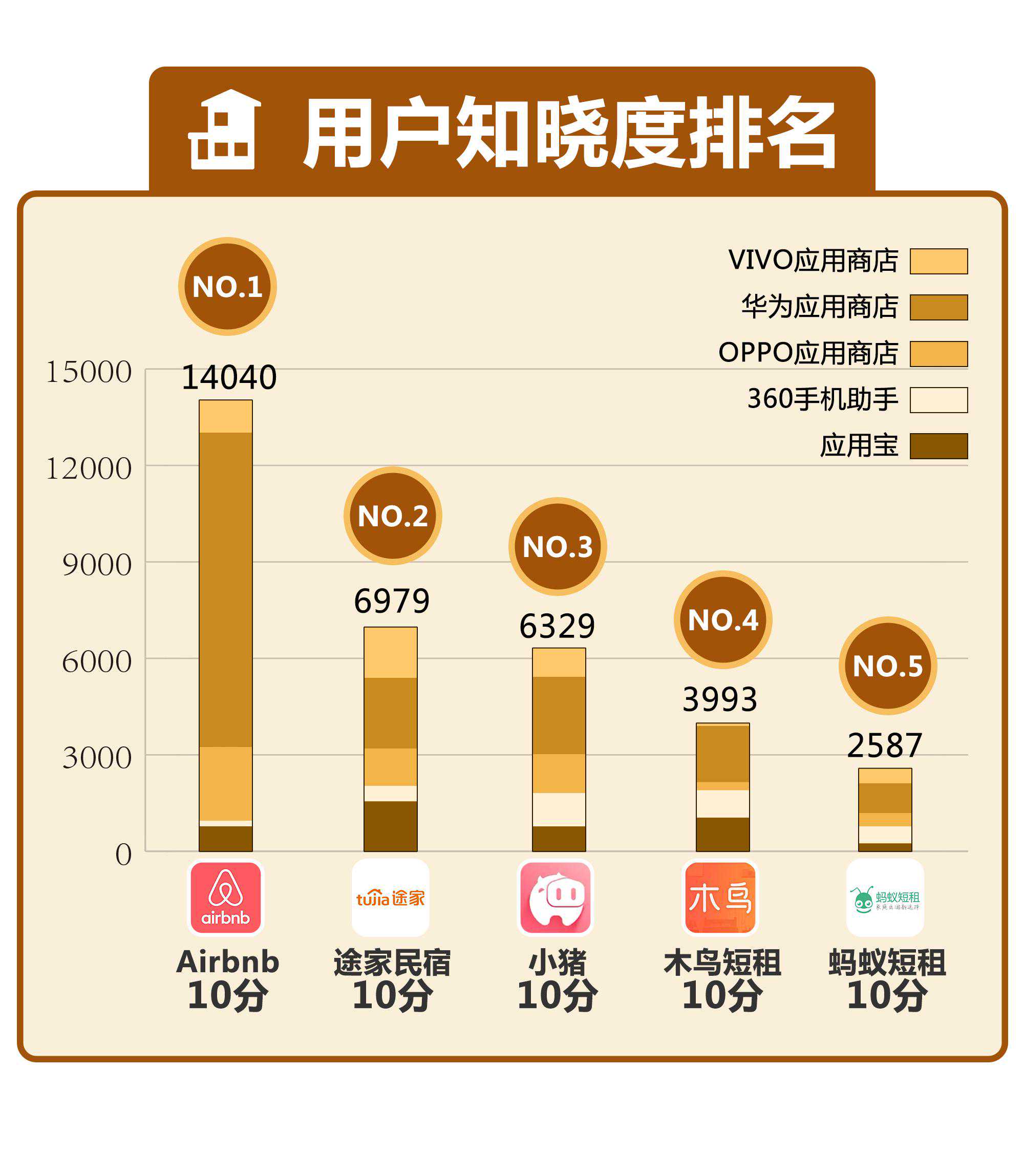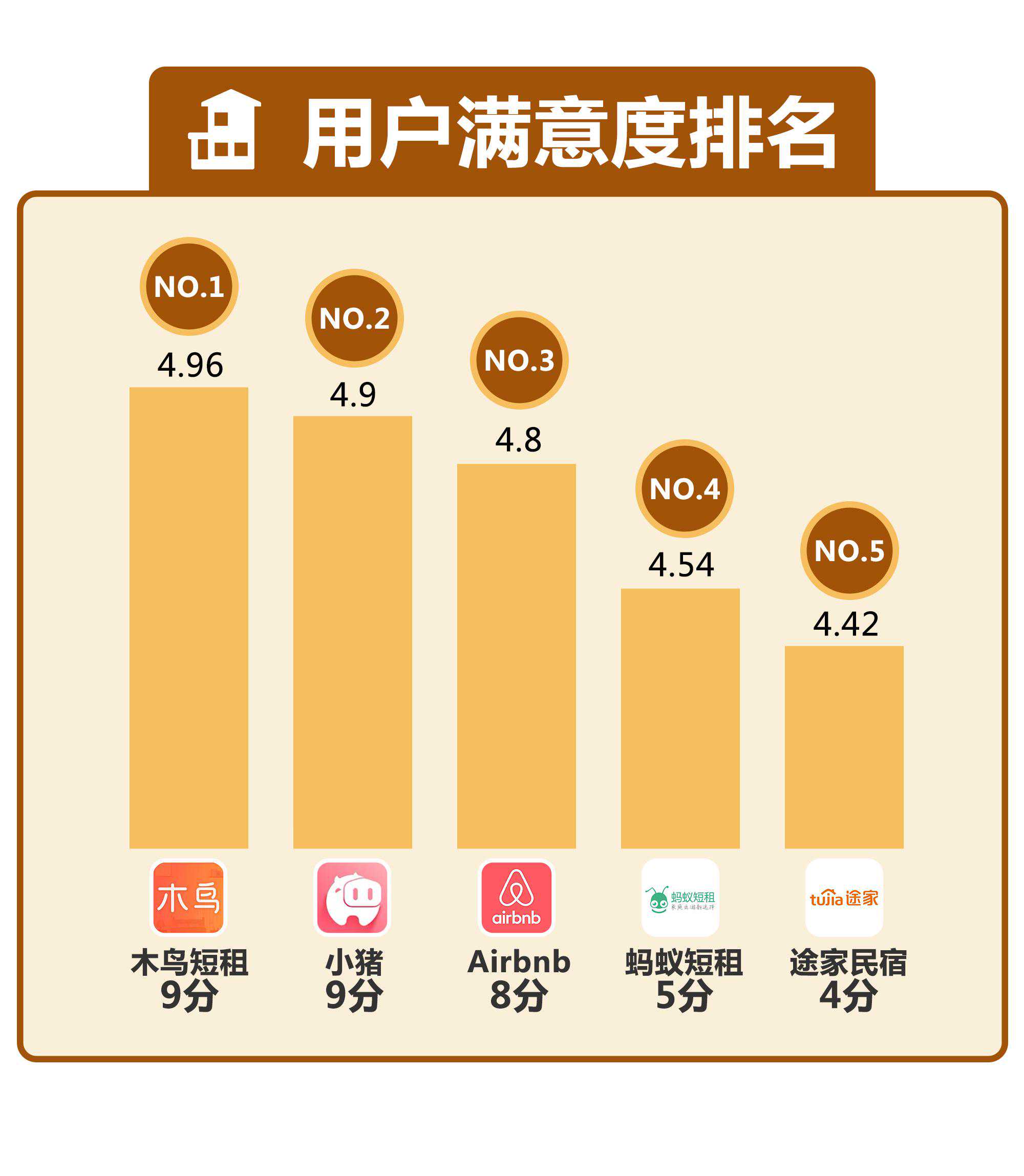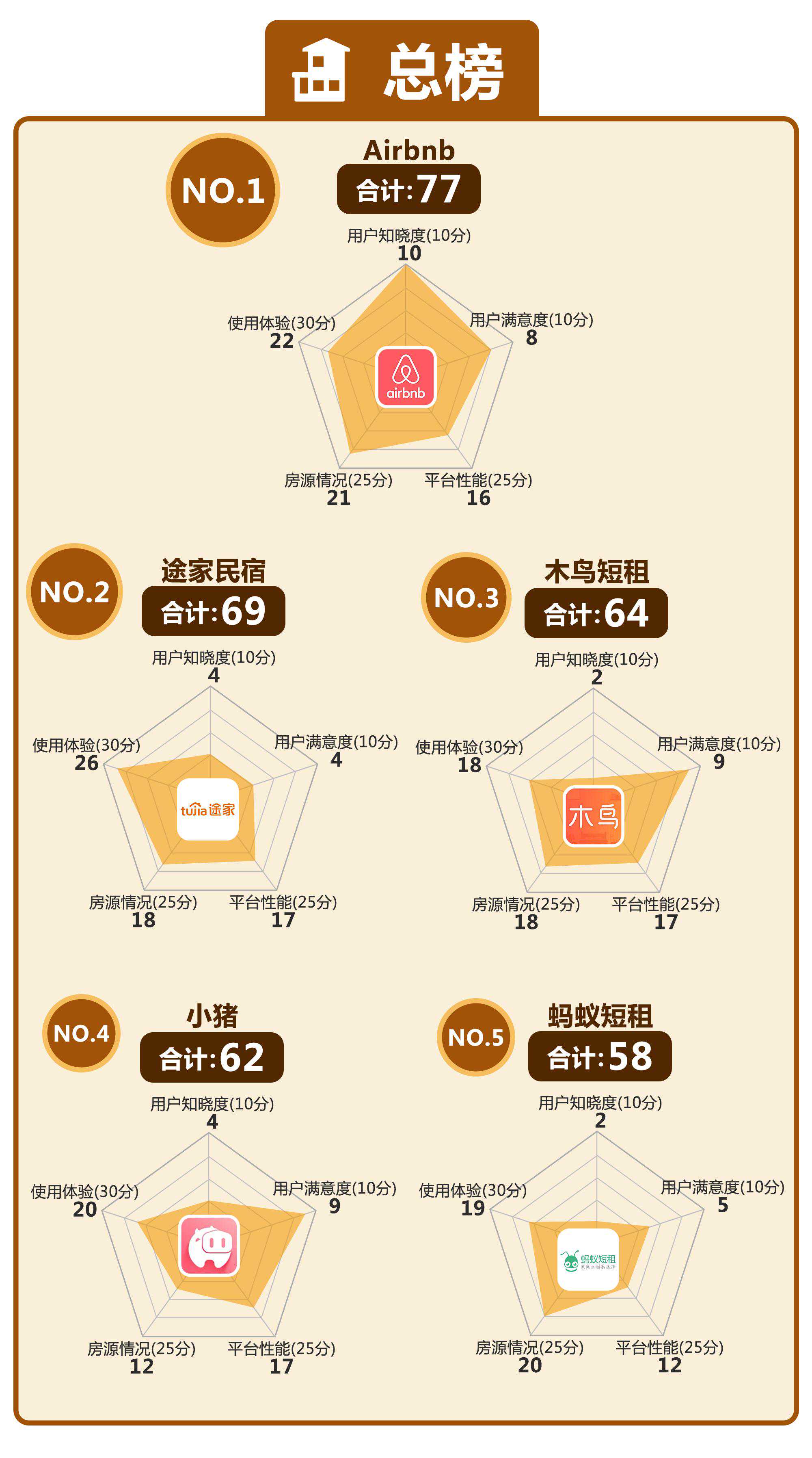节假日出行住哪里?民宿逐渐成为不少消费者尤其是年轻人的旅住选择。近年来,随着旅游需求的多元化发展,依托城市闲置住宅兴起、主打ins风、北欧风等独特设计风格的网红民宿吸引了旅者的目光。应市场需求而生,国内民宿预订平台2011年起迎来快速生长节点。 面对众多的民宿预订平台,消费者应该怎么选?哪家平台提供的民宿房源颜值最高?哪款APP软件预订民宿最便捷?南都鉴定选取目前市场上主流的5大民宿预订平台—Airbnb、途家民宿、小猪、木鸟短租、蚂蚁短租,分别从下载量、评分、功能、页面设计及房源信息等多项维度进行测评,分析民宿平台的不同特点及优劣。 注:本次测评总计100分,其中用户知晓度、用户满意度各占10分,平台性能、房源情况各占25分,使用体验为30分。 注:本次测评属体验式测评,产品体验感因人而异,结果仅供参考,不得用于商业用途。 【总榜】 Airbnb综合排名第一蚂蚁短租排名垫底 2019年9月25日至30日,南都鉴定评测实验室研究员以租客身份,对Airbnb、途家民宿、小猪、木鸟短租以及蚂蚁短租等五大主流民宿平台进行体验式测评。测评指标包括用户知晓度、用户满意度、平台性能、房源情况、使用体验五大维度。 其中,用户知晓度和用户满意度,是以各大民宿平台APP在安卓应用市场的下载量与安卓、IOS应用商店的评分为依据。平台性能则指各民宿平台的页面设计风格、功能设置;房源情况评价指标包括,平台提供房源数量、价位、消费点评数、图片美观度等;使用体验则以平台提供的房源筛选便利度、消费者预定退订等方面的流程便捷度为评测依据。 综合榜单显示,Airbnb获得77分排名第一,其次分别为途家民宿、小猪、木鸟短租,蚂蚁短租仅获得58分排名垫底。具体维度排名:在用户知晓度方面,木鸟短租、蚂蚁短租均仅得2分;途家民宿在用户满意度方面排名垫底;平台性能维度,蚂蚁短租表现稍微逊色;小猪显示房源点评数、室内环境等指标得分较低,在房源情况方面排名垫底;使用体验方面,木鸟在房源筛选及预退订过程中的便捷度相对较低。 【用户知晓度】 各大应用商店下载蚂蚁短租排名靠后 五大民宿预订平台在手机应用市场的下载次数,可从一定程度上体现平台对于消费者的影响力及吸引力。本次测评收集了各平台在国内手机应用市场的下载量,以此考察用户知晓度。下载量越大,则表明有更多用户知晓并选择下载该应用,从一定程度上反映了该应用的影响力越强。 在考察用户知晓度时,IOS应用商店未显示下载次数,本次测评以安卓主流手机应用市场的下载量为考察对象。根据艾媒咨询发布的《2018-2019中国移动应用商店市场监测报告》中2019年安卓应用商店排名,分别选取应用宝、360手机助手、OPPO应用商店、华为应用市场及VIVO应用商店进行考察。 综合来看,Airbnb在安卓主流应用市场中的下载量遥遥领先,共计14040万次;其次为途家民宿、小猪,分别为6979万次、6329万次;蚂蚁短租下载量最低,为2587万次。其中,在应用宝和VIVO应用商店中,途家下载量排名第一;而在华为应用商店和OPPO应用商店中,Airbnb下载量拔得头筹;小猪在360手机助手中被下载次数最多。蚂蚁短租在各大应用商店的下载量排名靠后,这或与其业务规模和房源数量有关。 【用户满意度】 途家和蚂蚁短租评分较低 在华为应用商店评分仅3星 综合来看,五个民宿预订平台在主流手机应用市场的评分基本都在4分以上,整体满意度良好。木鸟短租、小猪、Airbnb、蚂蚁短租和途家民宿在各大市场的平均分分别为4.96、4.9、4.8、4.54、4.42。 木鸟短租的评分在各个应用市场均排名第一,在IOS、应用宝、OPPO、华为、VIVO应用市场的评分分别为5、5、4.9、5、4.9。相比之下,途家和蚂蚁短租的评分较低,其中在华为应用商店的评分仅为3分。 【功能完善度】 小猪、蚂蚁短租平台 没有用户分享互动版块 Airbnb、途家、木鸟短租均设有用户互动版块,Airbnb在导航专设“故事”一级专栏,涵盖民宿、美食、景点、艺术、探店等内容,供用户上传照片、分享旅行体验或生活感悟。途家、木鸟短租的“发现”板块则聚焦于用户分享民宿体验,小猪、蚂蚁短租并无互动版块。 【操作便捷度】 操作便捷度指平台导航、板块等排列设置对于用户使用的易操作性。本次对于五大民宿平台操作便捷度的测评,主要通过对各大平台给使用者提供服务、满足实际需求方面进行考核。其中,与其他页面的分发属性不同,“我的”页面更具私密性和主动性,该版块专为用户定制,能够体现出不同平台的特性与对用户习惯的认知。 途家在“我的”页面中设置了“内容管理”版块,方便用户上传入住或旅游体验,在途家的感觉用户不仅是租客或房东,更是一个内容生产者。小猪专设有“小猪管家”版块,主要面向房东人群,在房客退房后提供专业保洁服务和订制的洗漱用品。相较于上述4个平台,蚂蚁短租的“我的”版块则显得中规中矩,仅显示了优惠券、收藏、浏览历史、常用信息、在线客服、开具发票六个基础功能。同时,其在线客服功能只提供电话呼叫,不提供线上智能答复。 【精选房源】 蚂蚁短租“优选”房源数量最多 小猪短租未设独立精选房源筛选项 本次对五大民宿平台房源情况的测评,主要包括对各大平台精选房源数量(满足入住条件、经过平台认证的精品民宿房源数量)、房源整体价格(平台