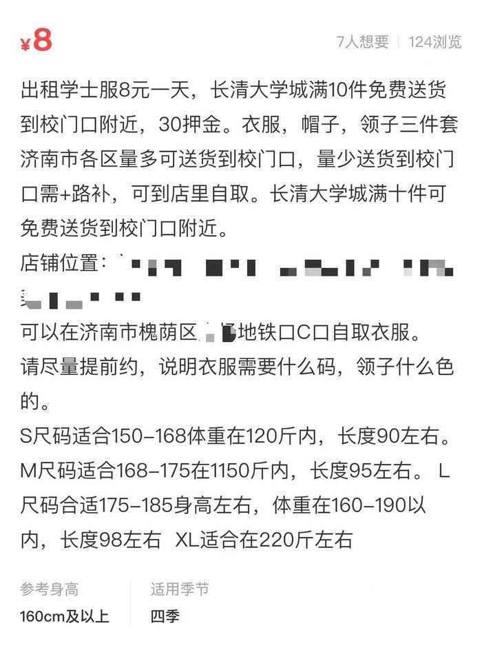 随着2023毕业季的到来,大学校园里逐渐出现了许多头戴方形帽、身披黑色学士服拍照留念的毕业生,他们彼此用手机、相机,记录下美好的大学校园。新黄河记者调查发现,随着毕业季经济的火热,不少商家与高校学生也利用出租学士服等服装来赚上一笔。 “全新学士服、硕士服,量大可议价。可按小时、半天、全天租赁。备有旗袍、JK裙等多种样式,满20件免运费,欢迎咨询。”在济南高校内学士服的租赁广告随处可见。 “单独一套学士服出租是8元一天,班级集体预订,价格可以再便宜点。”济南一所高校经营学士服出租的学生王丽介绍。“目前来租学士服的,基本上都是以班级为单位,集体预订的有五个班,单独预订的暂时还不是很多。” 记者了解到,每年的3月到6月,是学士服租赁的旺季,由于出租生意非常火爆,往往需要提前预订。“虽然现在有的同学毕业服装、毕业照拍摄的生意都做,但我只做服装出租,都做的话容易忙不过来反而影响质量。”王丽说。 “尽管一件学士服出租一次还不到10元钱,看上去赚不了多少,但学校里要拍毕业照的同学需求量很大。”今年读大三的王丽,特意新购置了一批学士服等待旺季的到来。“我们家出租的衣服既干净又整洁,服务也比较周到,同学们特别喜欢,大家互相之间推荐,所以单子就很多。基本一周左右时间,就可以靠租赁服装入账1000-2000元左右。” 除了常规的学士服,王丽还准备了不少其他样式的服装。“旗袍日租价30元,礼服日租价要40元,JK学生套装日租价20元。价格虽然不高但也算得上薄利多销。” 新黄河记者在团购软件搜索“学士服出租”等关键词,发现相比线下租赁的火爆,团购软件中学士服出租的热度反而不高。“本身单次租赁价格就不高,相比在校园内租赁服装,团购平台中的买家还需要额外承担运费,再者学士服的质量也有不确定性。所以线上租赁的销量往往不尽如人意。”一位卖家表示。新黄河记者陈元昊编辑刘梅梅