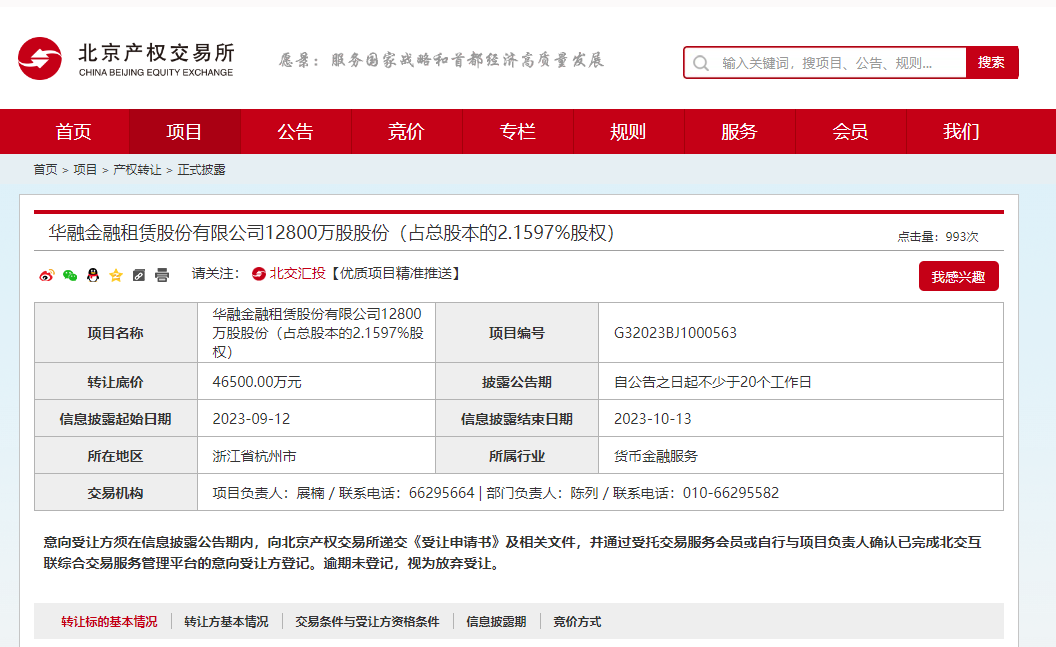 中国网财经10月7(记者鹿凯)近日,北京产权交易所披露相关股权转让信息显示,中船财务有限责任公司(简称:中船财务)所持华融金租12800万股股份(占总股本的2.1597%股权),正在该所公开挂牌转让。该股权转让挂牌价格为4.65亿元,披露截止日期为2023年10月13日。对于上述股权转让,中国网财经拨通华融金租官网披露电话,对方表示,此为前台电话,不了解相关情况,无法转接其它电话。 转让公告披露的审计报告数据显示,截至2023年7月末,华融金租资产规模为1132亿元,2023年前7个月实现营业收入34.49亿元,实现净利润12.14亿元。 华融金租是经国家金融监管总局批准主营融资租赁业务的金融机构,是中国首批金融租赁公司之一。公司前身为成立于1986年的浙江省租赁有限公司,2001年改制为浙江金融租赁股份有限公司,2006年由大型国有金融企业中国华融资产管理股份有限公司(“中国华融”,2799.HK)控股,注册资本约59.27亿元。公司总部位于浙江省杭州市,设有宁波、金华分公司以及全资子公司华融航运金融租赁有限公司。 以下为此次股权转让标的华融金租前十名股东持股情况: 记者注意到,目前中国华融仍为华融金租控股股东。而早在2021年11月17日,中国华融曾发布公告表示,拟启动华融金租股权转让项目立项。并指出,本次股权转让拟采取公开方式,在依法设立的省级以上(含省级)产权交易机构转让中国华融所持华融金融租赁共计47.37亿股股份,股权占比79.92%。首次挂牌价格应不低于经财政部备案的资产评估结果,评估基准日确定为2021年9月30日。 记者梳理近三年华融金租业绩表现发现,其净利一直处于下降趋势,从2020年的15.60亿元下降至2022年的12.14亿元,受此影响其平均资产回报率也有所下降,从2021年的1.18%下降至2022年的1.07%。 截至2022年12月末,华融金租资产总额403.52亿元,负债总额340.44亿元,所有者权益63.08亿元;其中,资本净额68.17亿元,资本充足率15.50%;核心一级资本净额63.00亿元,核心一级资本充足率14.32%。 (责任编辑:王擎宇)
