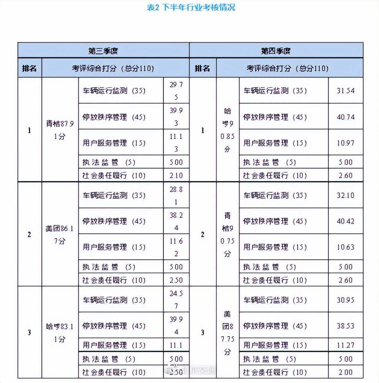 关于互联网租赁自行车行业2022年下半年运营监管情况的公示 依据《北京市非机动车管理条例》《北京市互联网租赁自行车服务质量信用考核办法》等相关规定,现将2022年下半年本市互联网租赁自行车行业相关情况公示如下: 一、2022年下半年互联网租赁自行车行业运行情况 在本市运营互联网租赁自行车的企业(以下简称“单车企业”)共3家,北京摩拜科技有限公司(以下简称“美团”)、上海哈啰普惠科技有限公司(以下简称“哈啰”)、广州骑安科技有限公司(以下简称“滴滴青桔”)已按规定将运营车辆信息接入北京市互联网租赁自行车监管与服务平台,并接受市、区、街道(乡镇)管理部门的监督管理。 下半年全市互联网租赁自行车累计骑行量5.49亿人次,日均骑行量298.41万人次、车辆日平均周转率为3.02次,受疫情影响同比2021年下半年下降8.76%。2022年全年累计骑行量9.68亿人次,同比2021年全年增长1.66%。 各单车企业日均投入运维力量1376人、码放12.44万辆次、调运15.03万辆次。根据《北京区域互联网租赁自行车行业规范用户停放行为联合限制性公约》,下半年有143人被纳入3家单车企业联合限制骑行名单,较上半年下降70%。 在重大活动保障和疫情防控重点时期,各单车企业积极履行企业社会责任,为一线工作人员提供免费骑行服务,持续开展“无差别”消杀,科学调配车辆,助力绿色出行,较好完成各项保障任务。此外,各企业发挥自身科技优势,不断提高精细化服务水平,美团单车在客户端上线“目的地搜索导航”功能,滴滴青桔将部分车辆置换为分体锁以提高车辆定位精度,哈啰单车应用“P点停车语音导航”功能,为市民出行和城市管理提供便利。 二、2022年下半年互联网租赁自行车行业管理情况 综合考虑季节特点、骑行需求、车辆使用效率及前期试点效果,我市启动2022-2023年度中心城区互联网租赁自行车淡季减量工作,2022年12月至2023年3月调控期内中心城区运营车辆总量由80万辆调减至60万辆,其他区结合区域内实际情况适度调整(详见表1)。 下半年各区监管部门累计开展车辆合规性投放扫码核查53.60万辆次,月均合规车辆投放比例为98.8%,综合全年月均合规率高于98.5%,总量调控政策得以落到实处。利用网格巡查机制,156个街道459名工作人员使用调度小程序发布14942次秩序维护工单,企业运维响应率为92.89%,政企互动效率显著提升。 截至2022年底,核心区所有轨道站点均已实现电子围栏监测管理全覆盖,朝阳、海淀、丰台、石景山区轨道站点电子围栏覆盖率达到50%以上,其他区启动建成区全区域入栏管理工作。市级管理部门组织各区开展停车设施规范性核查,及时整改未按标准施划的停放区,引导市民文明有序停放,车辆停放秩序有明显改善。 三、2022年下半年互联网租赁自行车行业考核情况 市、区、街道(乡镇)管理部门及第三方机构持续对单车企业运营服务质量实施综合考评,中心城区各单车企业综合评分较上半年有明显提升(详见表2)。 下半年通州区、房山区、大兴区参照《北京市互联网租赁自行车服务质量信用考核标准及评分细则》,已制定区级考核管理办法并试点组织对区域内运营的单车企业实施综合考核,其他区结合区域实际情况正在制定相关方案,各区考核结果将作为区域内总量调控的重要依据。