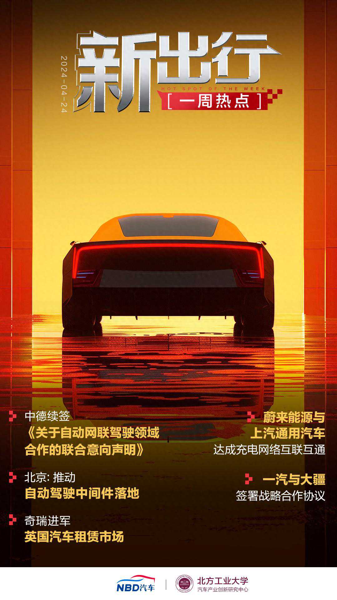 【中德续签《关于自动网联驾驶领域合作的联合意向声明》】工信部官网消息显示,4月16日,工业和信息化部部长金壮龙与德国联邦经济和气候保护部、联邦数字化和交通部代表共同签署了《关于自动网联驾驶领域合作的联合意向声明》。中德双方将进一步深化自动网联驾驶/智能网联汽车领域政府、机构产业等多层面对话交流,开展标准规范制定、技术法规协同、数据采集传输、法规政策交流、无线电频率协同、测试示范应用等多方面合作,推动两国智能网联汽车产业高质量发展。 点评:中德签署《关于自动网联驾驶领域合作的联合意向声明》是双方技术合作的重要步骤。这一合作将促进双方在智能汽车领域的政策、标准和技术交流,有助于推动产业进步,增强国际竞争力。 【北京:推动自动驾驶中间件落地】4月19日,北京市经济和信息化局印发《北京市加快建设信息软件产业创新发展高地行动方案》,要求布局软硬件协同的新软件。组织车企与信息软件企业结对攻关,加强车规级芯片、车载软件、大模型技术融合创新,推动自动驾驶中间件落地,加速智能界面软件上车,研发汽车软件大模型开发工具。 点评:北京市推进信息软件产业创新发展行动,显著助力汽车与IT产业融合。聚焦车载软件与智能技术,此策略不仅促进本地车企信息化升级,也为软件企业打开新市场。通过产业结对攻关,将进一步巩固北京在高端制造和科技创新的领导地位。 【奇瑞进军英国汽车租赁市场】日前,奇瑞汽车旗下的Omoda品牌与英国一家汽车租赁公司建立了合作关系。英国汽车租赁公司“OctopusElectricVehicles”表示,将出租Omoda品牌的电动汽车,同时会提供低成本的充电和充电桩安装服务。据介绍,这家汽车租赁公司运营着一支由1.5万多辆电动汽车组成的车队,可供个人和企业租用。 点评:奇瑞进军英国租赁市场,标志着中国汽车品牌在欧洲电动车领域又迈出关键一步。通过与“OctopusElectricVehicles”的合作,不仅拓宽销路,更能接触到更广泛的用户群体。低成本的充电服务将进一步提升消费者体验,对品牌形象和市场占有率无疑是正面的推动。 【蔚来能源与上汽通用达成充电网络互联互通】4月18日,武汉蔚来能源有限公司(以下简称蔚来能源)与上汽通用汽车销售有限公司(以下简称上汽通用)正式达成充电网络互联互通合作。根据合作协议,上汽通用将全面接入蔚来充电站,覆盖高速、商圈、办公区、小区、景区、酒店等多个高频场景。上汽通用旗下凯迪拉克和别克品牌新能源汽车用户,后续可通过相应品牌App的充电地图功能,实时查看到蔚来充电桩的位置、价格、实时状态等信息,并可快捷完成扫码充电、订单支付等操作,享受蔚来能源提供的覆盖更广、体验更高效的充电服务。 点评:武汉蔚来能源与上汽通用的充电网络互联互通合作,是行业内部互联互通的积极实践,将有效解决新能源车主的充电痛点。此举有助于加速建设完善的充电基础设施网络,提升用户充电体验,促进新能源汽车行业健康发展。 【一汽与大疆签署战略合作协议】4月18日,在中国第一汽车集团第五届科技大会上,中国第一汽车集团与大疆正式签署战略合作协议。双方将在智能驾驶领域开启全面战略合作,重点在红旗车型研发过程中结合各自专业优势,加强高级别自动驾驶平台、端到端智慧出行、先进高性能传感器等方面协同创新,共同打造技术领先的智能驾驶解决方案,引领智能驾驶技术方向。双方还将探讨更深层次的合作,以原创技术、卓越产品和极致服务为广大用户带来更加安全、智能、便捷的出行体验。 点评:中国第一汽车集团携手大疆进军智能驾驶,将深化中高端汽车市场的技术竞争。此次合作聚焦红旗品牌,意在利用各自核心技术打造创新智能驾驶解决方案。双方共同探索前沿技术,有望加速智能网联汽车的发展,提升用户的驾驶体验。 每日经济新闻